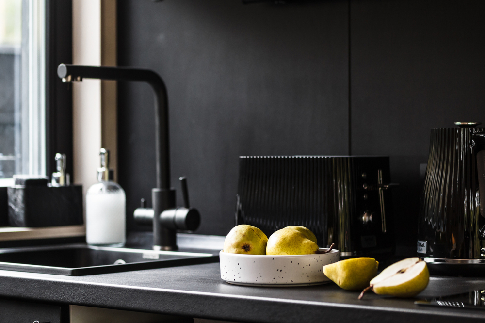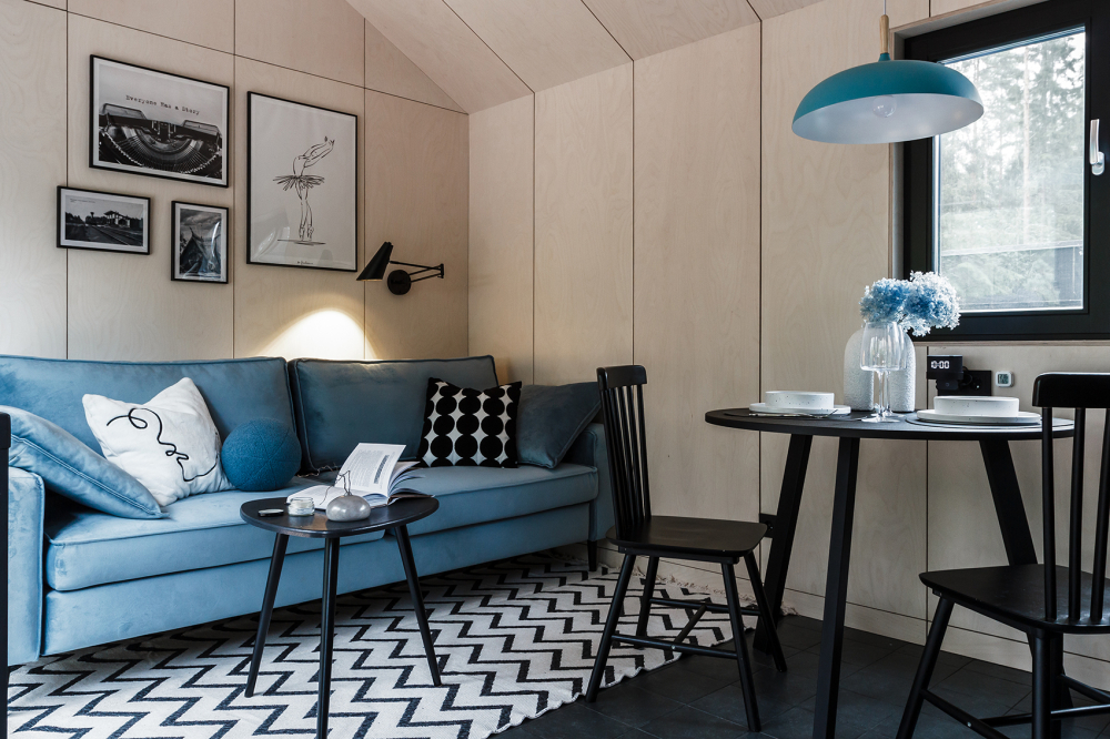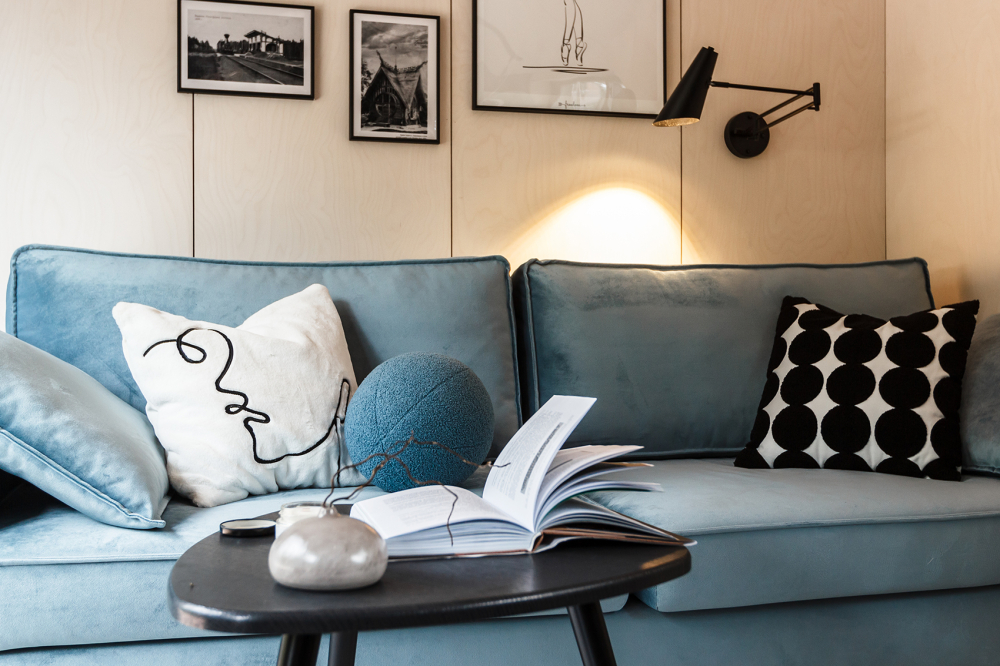 Стильный интерьер в тёмных тонах с голубыми акцентами