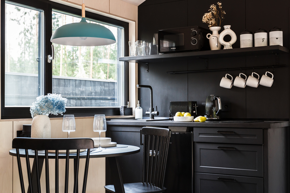 Кухня полностью оборудована: варочная панель, микроволновка, чайник, тостер, кофеварка, посуда, бокалы, кастрюли, сковороды и утварь.