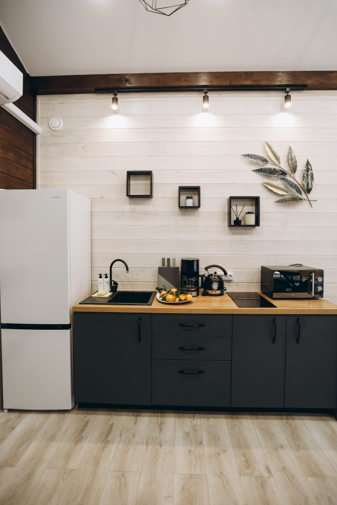 -Современная кухня-гостиная оснащённая современной бытовой техникой: кофеваркой, индукционной плитой, телевизором, кондиционером и другим оборудованием