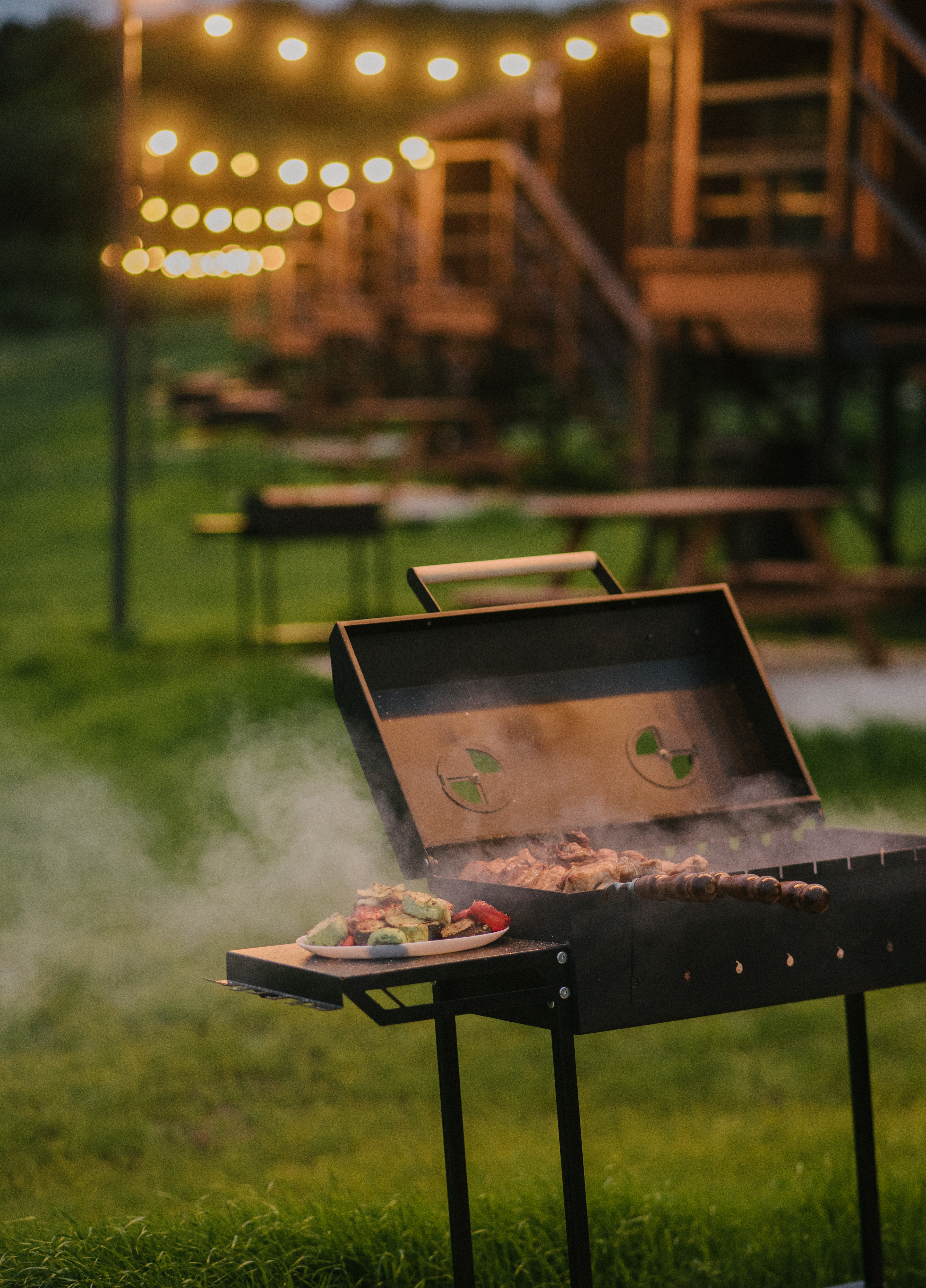 У террасы каждого барнхауса располагается собственная BBQ зона с мангалом, шампурами и сеткой, которые входят в стоимость проживания. За отдельную плату можно приобрести вязанку дров, стоимостью 500 рублей, угли, стоимостью 750 рублей и розжиг, стоимостью 230 рублей.