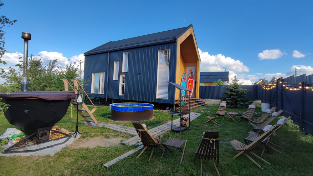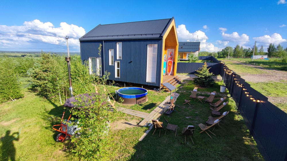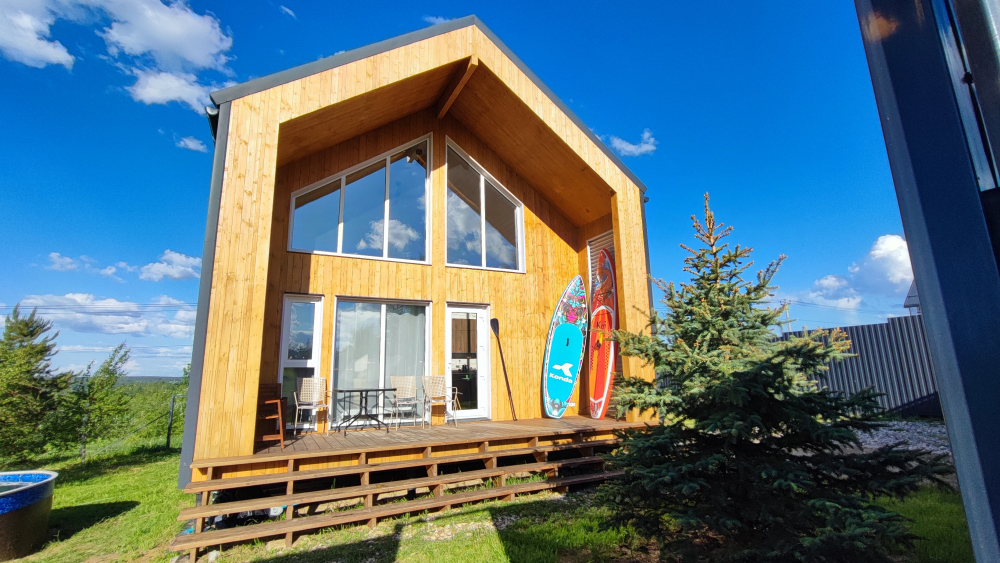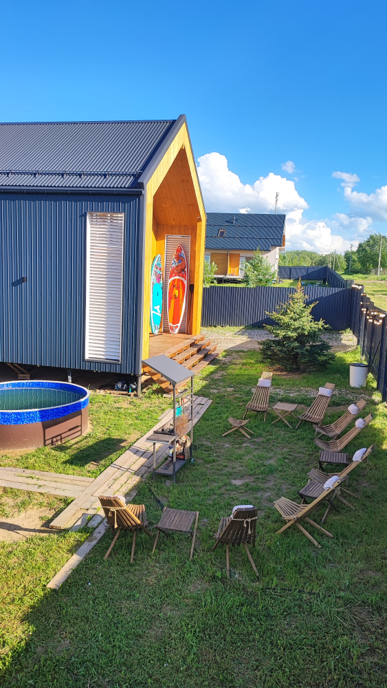 Рядом с домом есть горячая купель под открытым небом . Допм есть аренда сап бордов. 1000