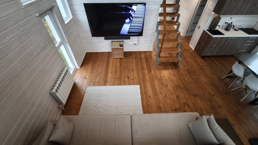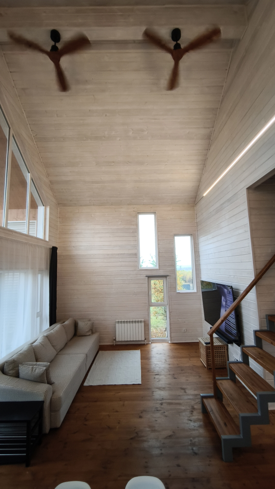 - Большая гостиная с мягким диваном, панорамными окнами, высоким вторым светом и телевизором с диагональю 86" — обеспечивает уютные вечера.