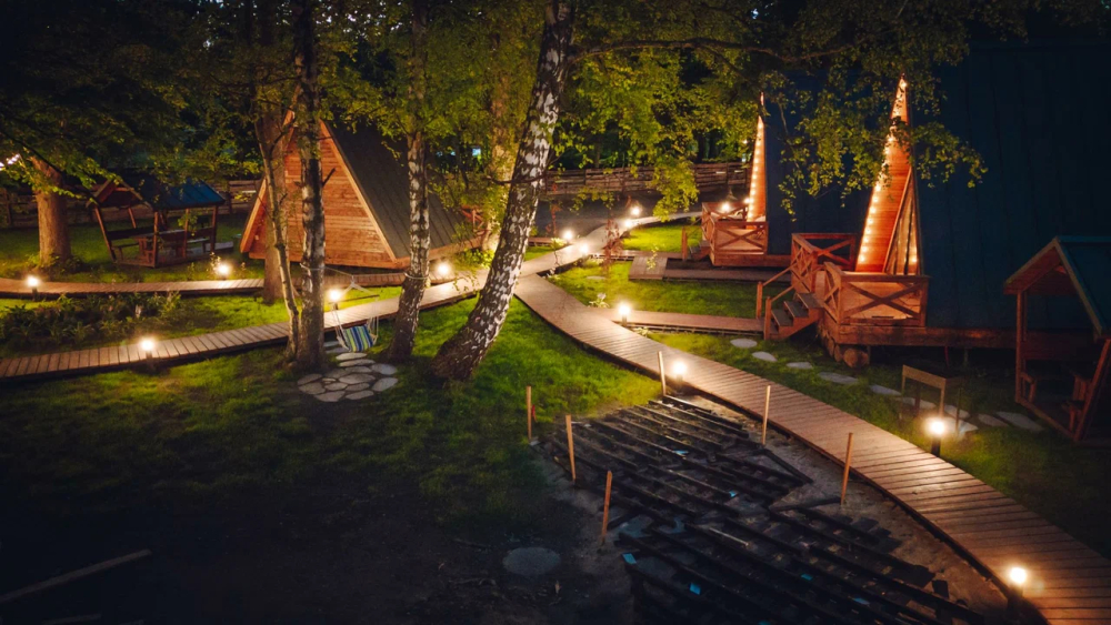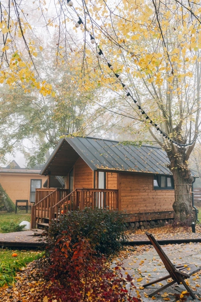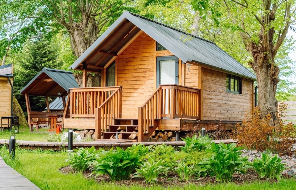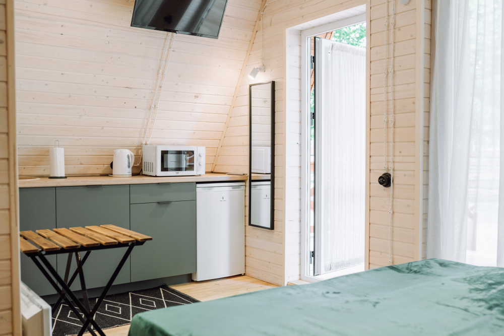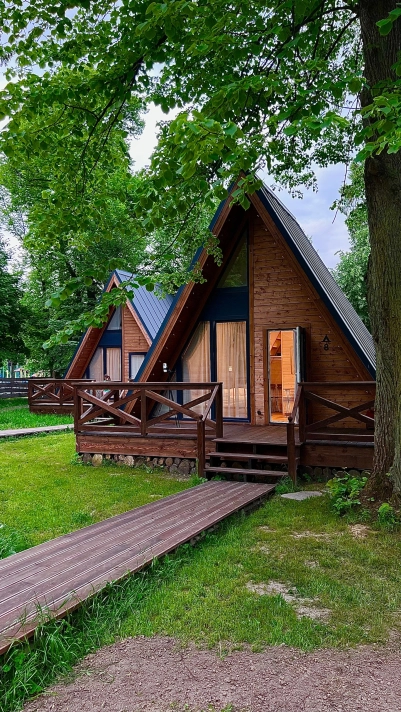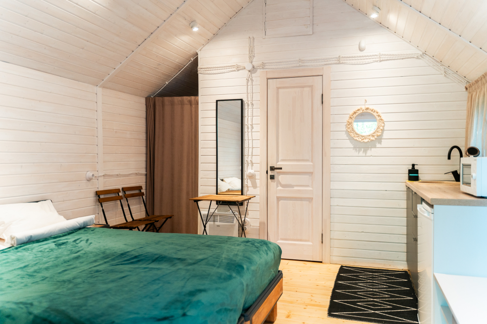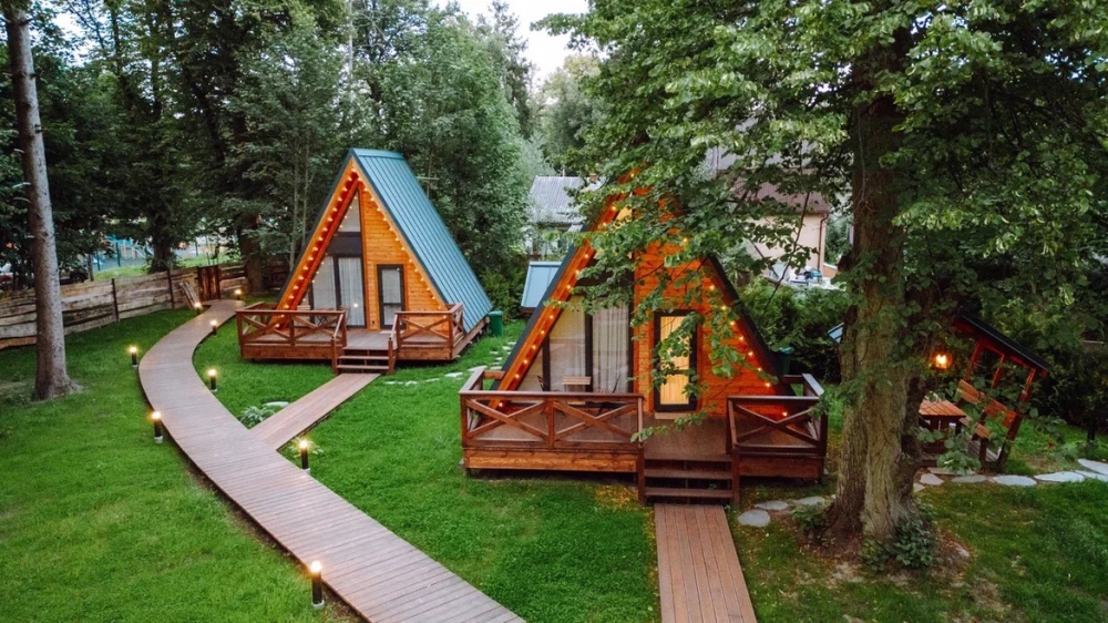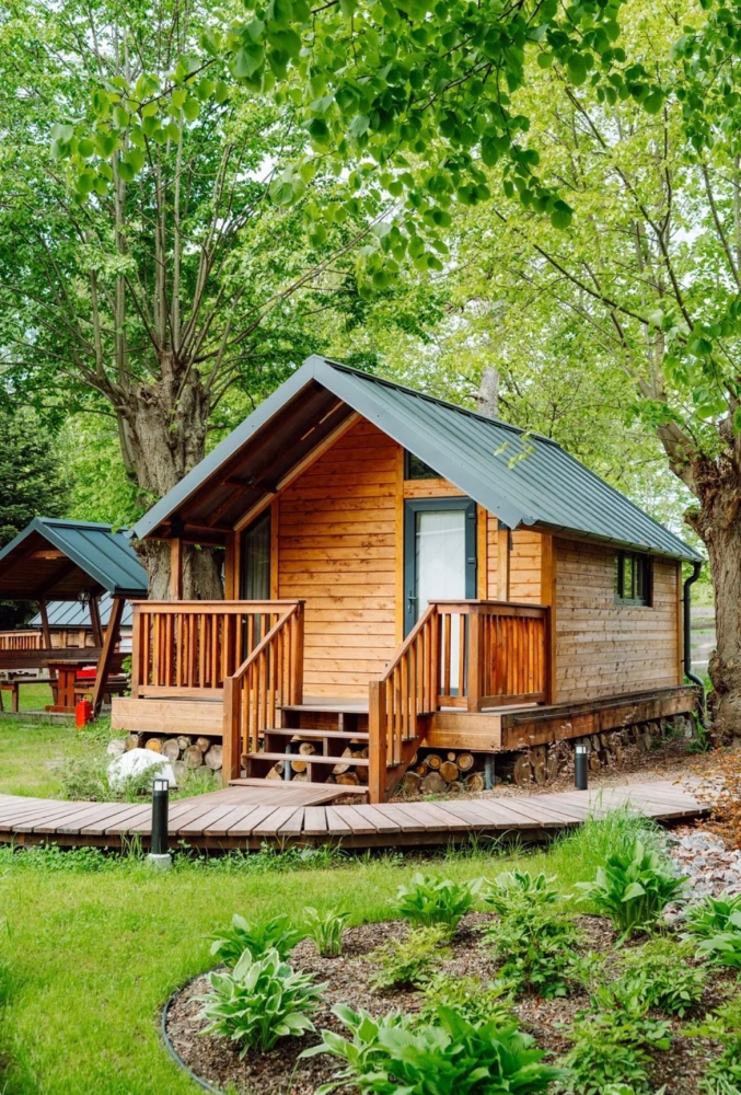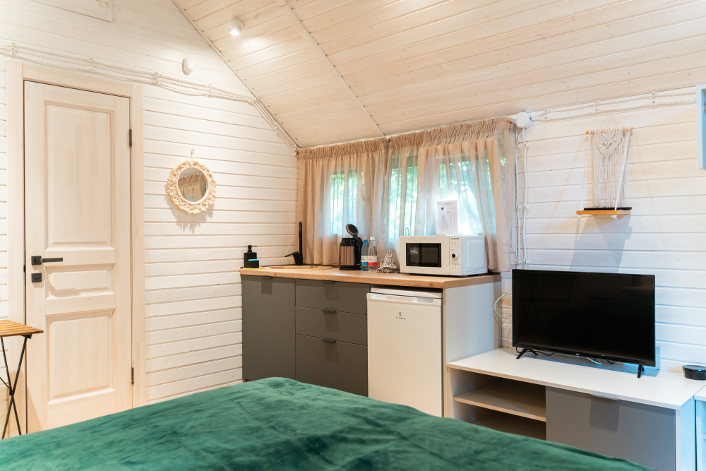 - Комфортабельные домики: разные по вместимости, полностью укомплектованные мебелью и техникой — готовы к вашему проживанию.