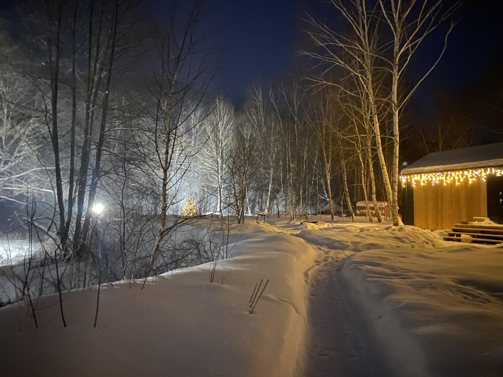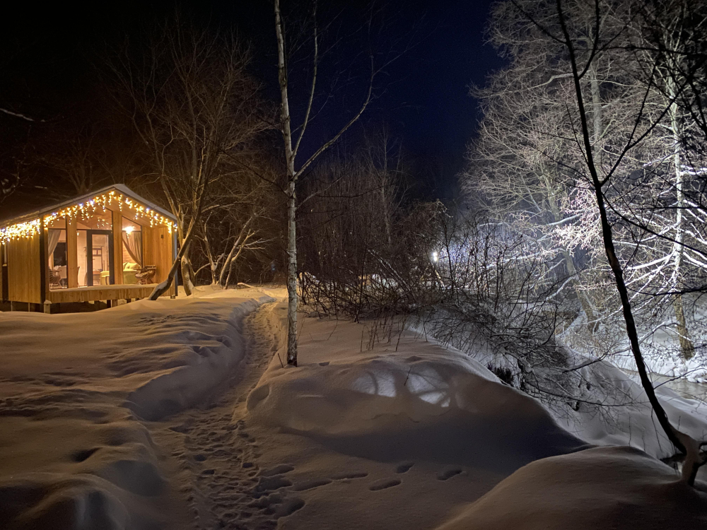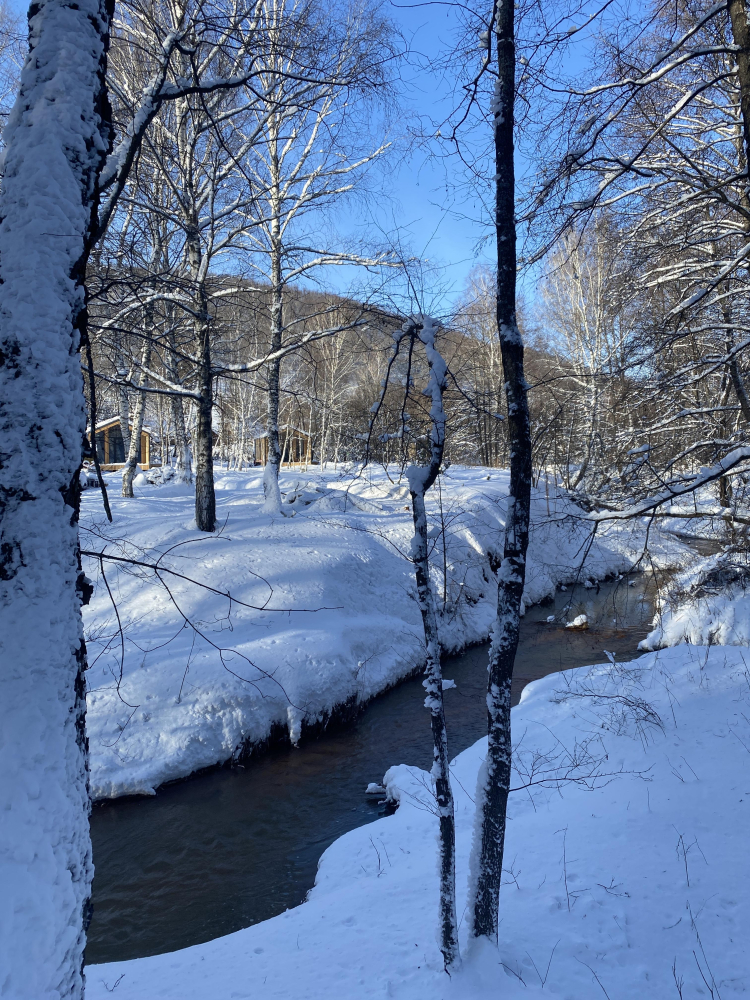 Прямо за окнами домиков протекает незамерзающая речка. купаться в ней нельзя, но виды зимой и летом чудесные.