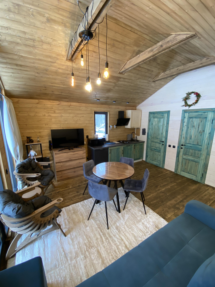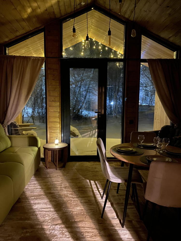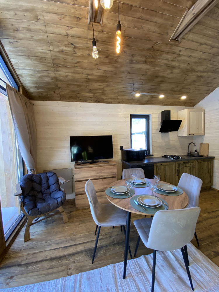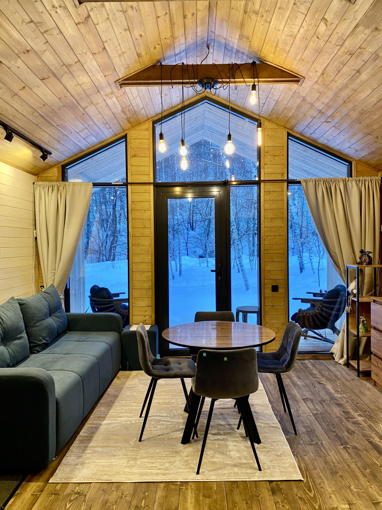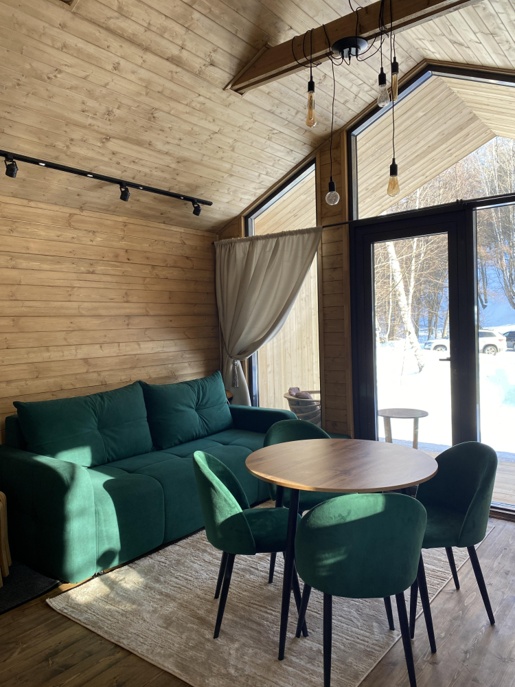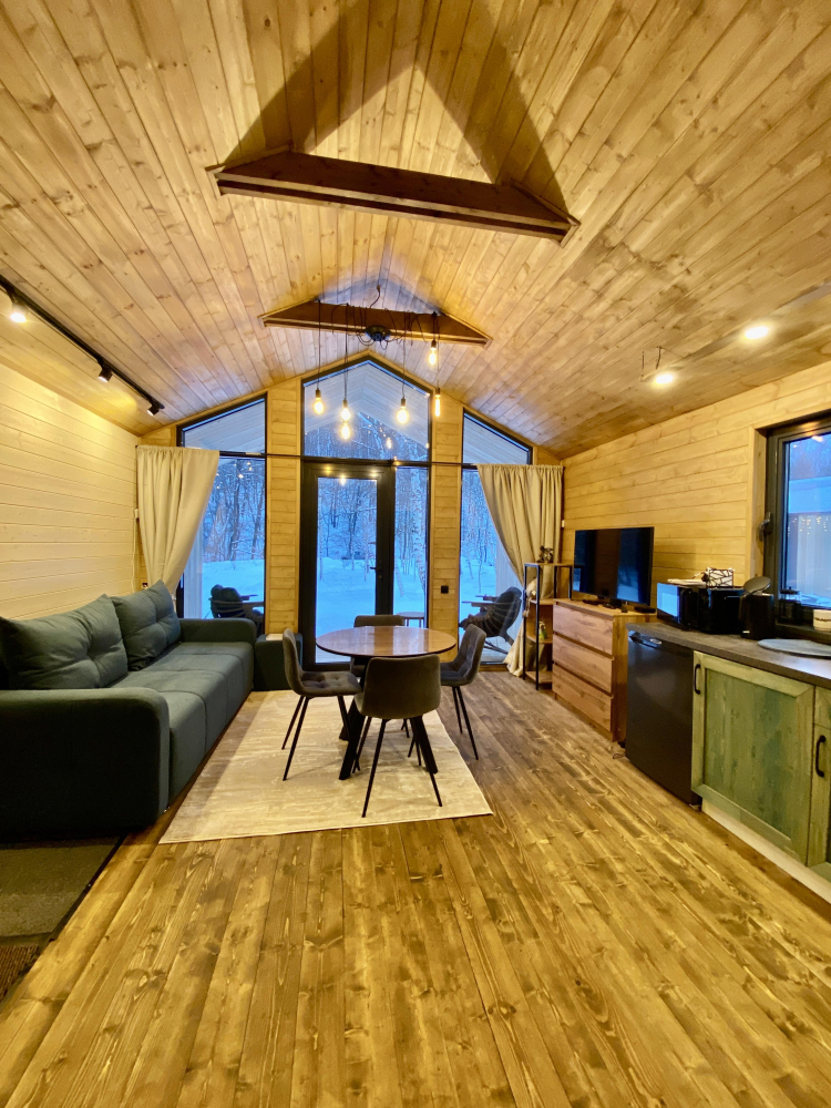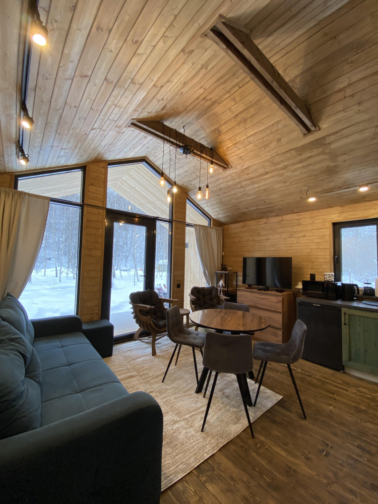 -Здесь вы найдете просторные, теплые и уютные дома, продуманные до мелочей для вашего максимального комфорта. Все дома полностью укомплектованы современной мебелью и техникой, выполнены в стильном интерьере и рассчитаны на комфортное размещение до 5 гостей. Панорамные окна позволяют любоваться захватывающими видами на горы и лес прямо из дома, создавая атмосферу уединения и гармонии с природой.