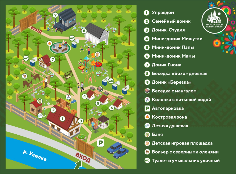 - Настоящие северные олени на территории – вы сможете кормить и гладить этих удивительных животных, что подарит детям и взрослым яркие, запоминающиеся эмоции.
