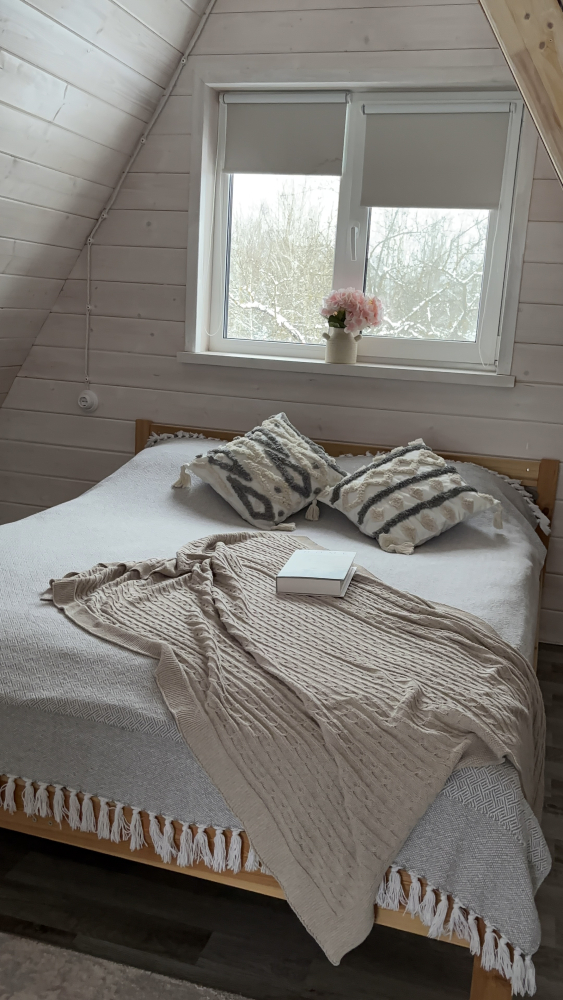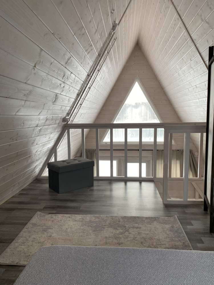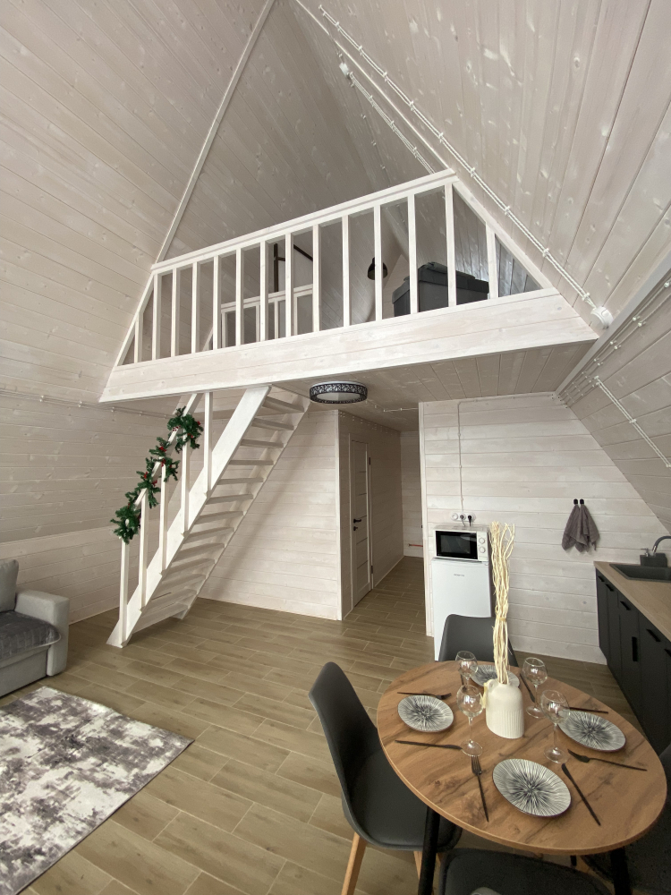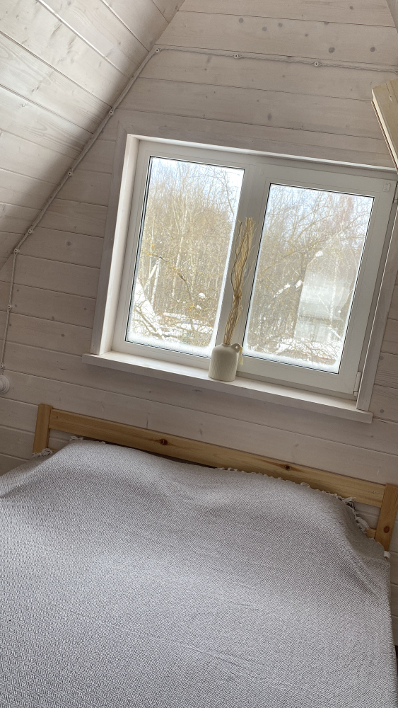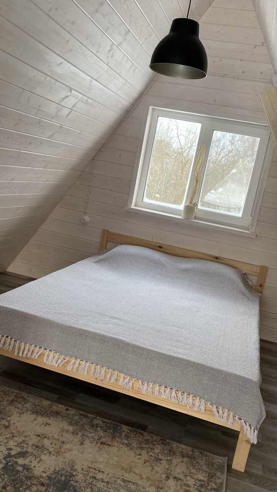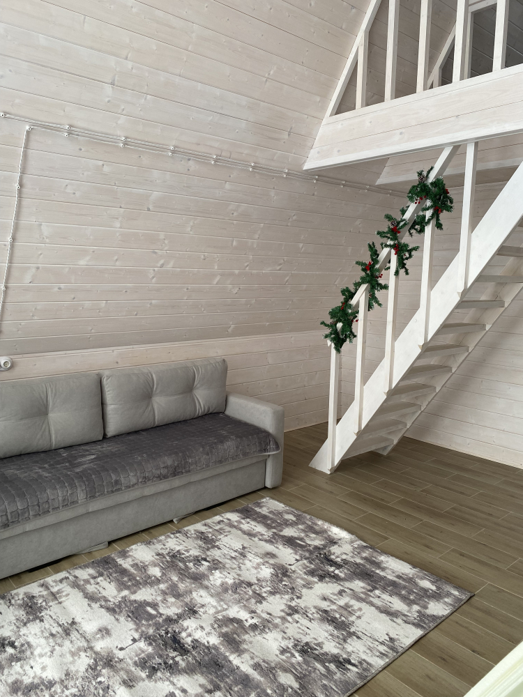 - Спальное место: кровать размером 160×200 см на втором этаже и раскладной диван на первом.