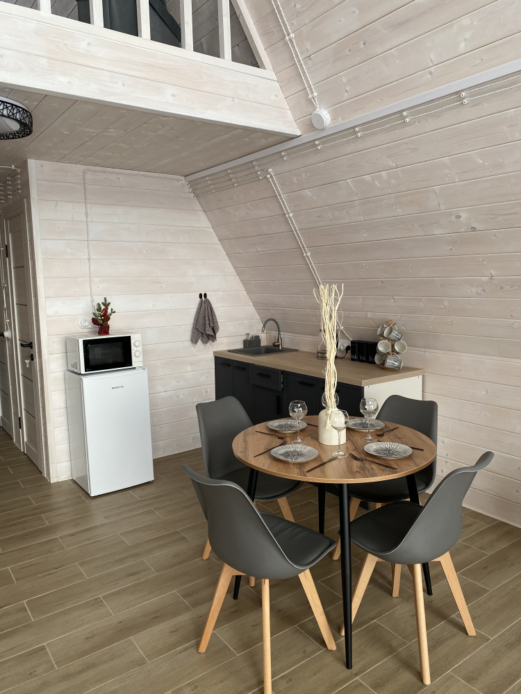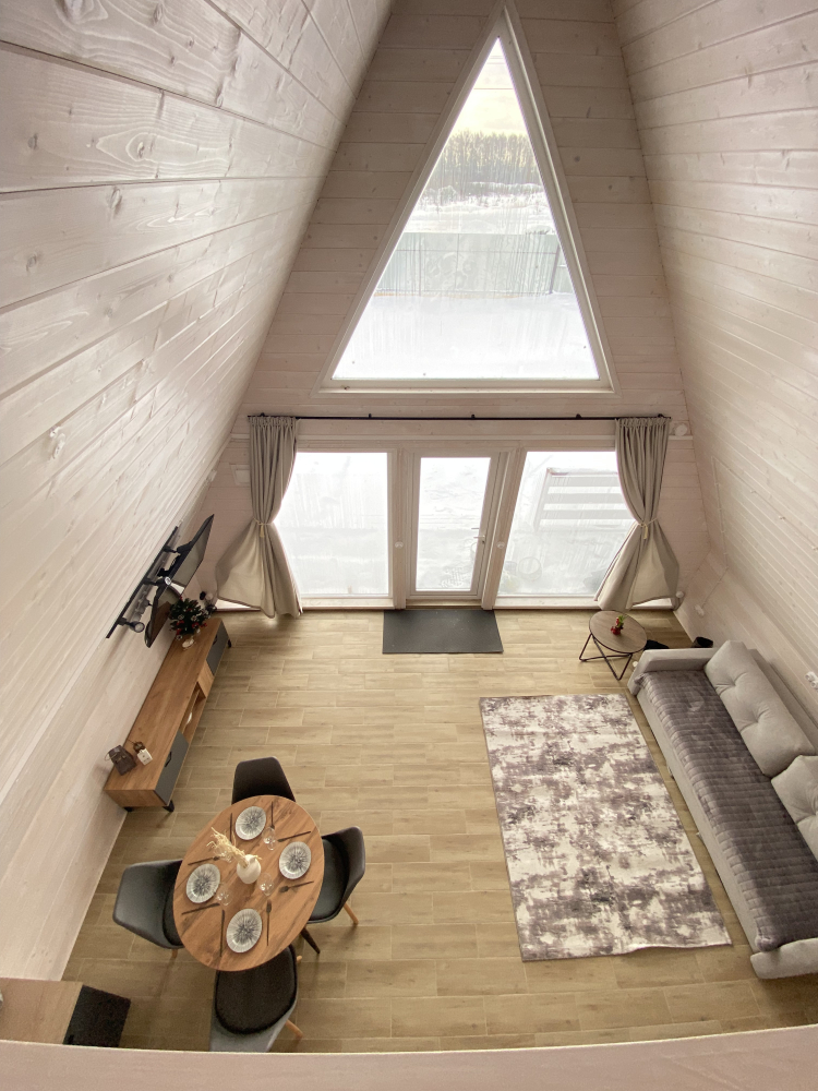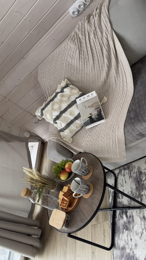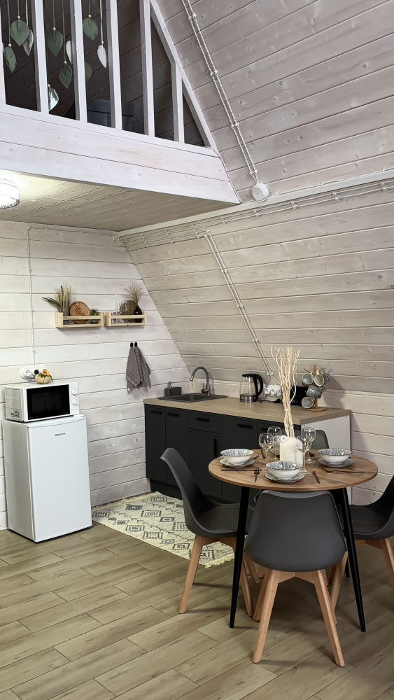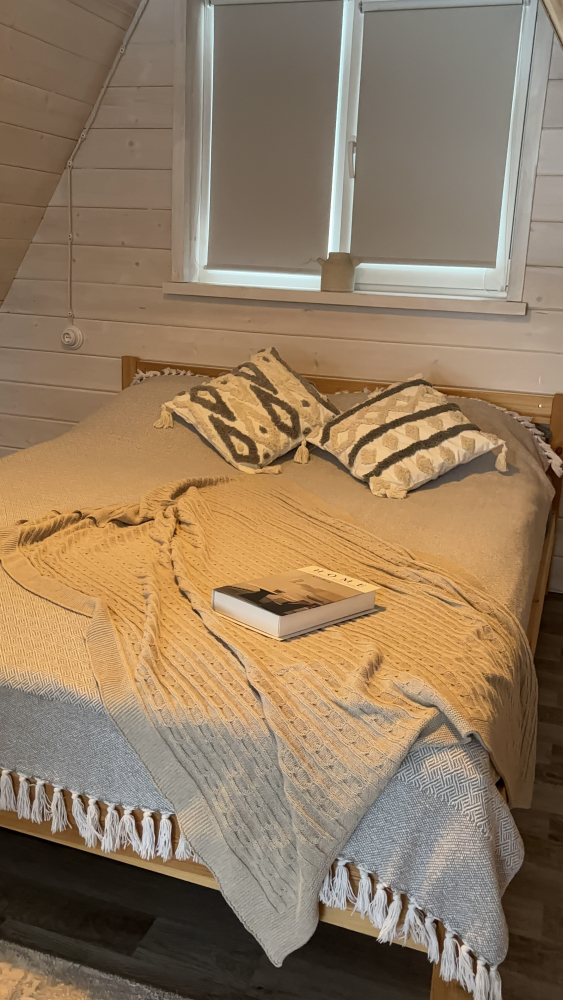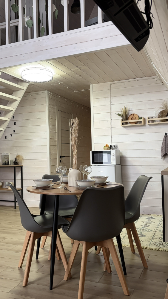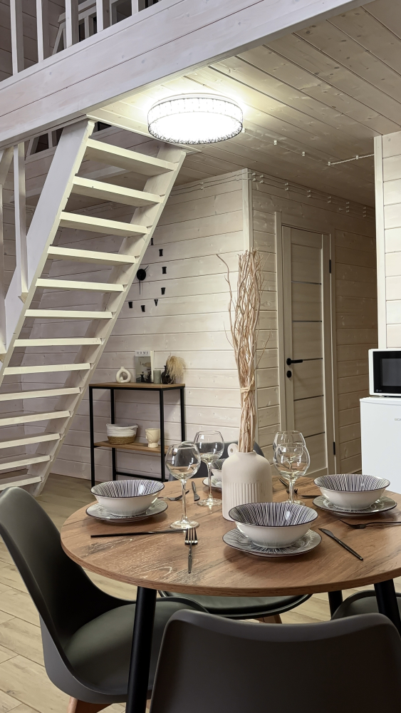 - Спальное место: кровать размером 160×200 см на втором этаже и раскладной диван на первом.