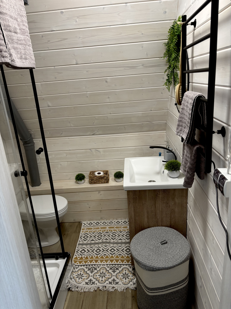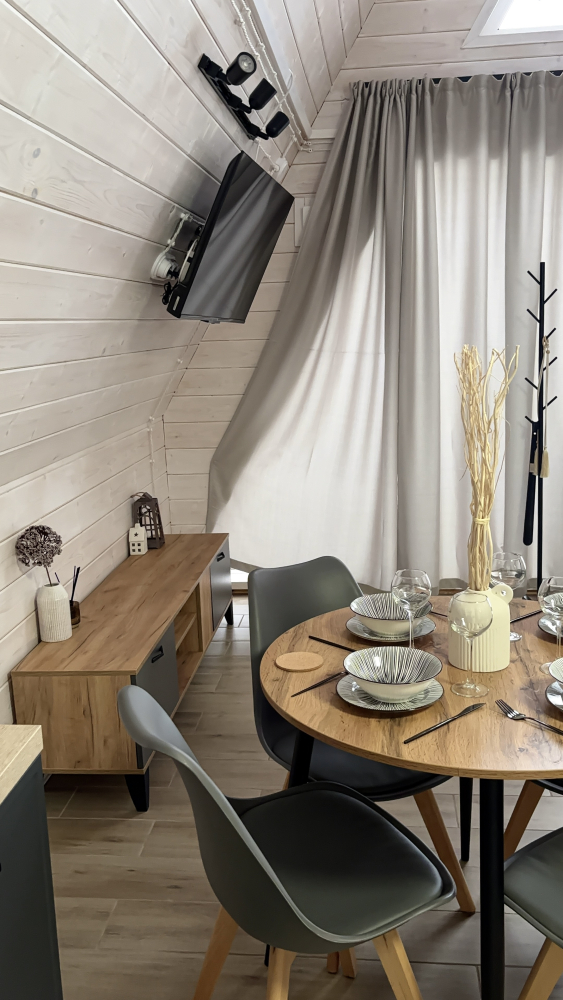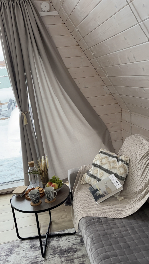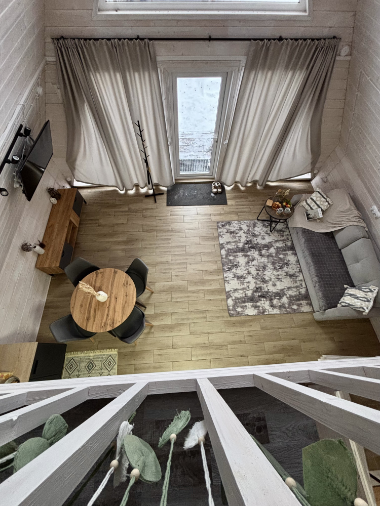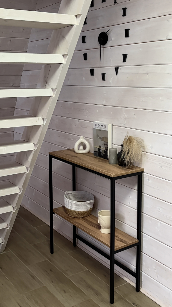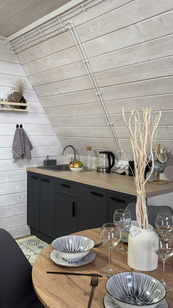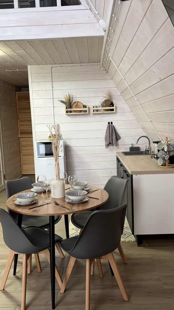 - Спальное место: кровать размером 160×200 см на втором этаже и раскладной диван на первом.