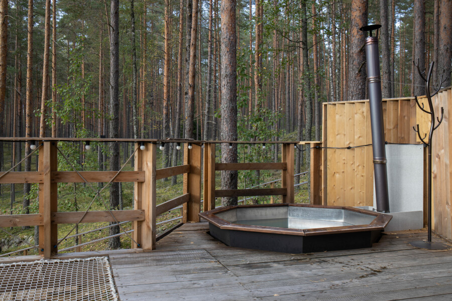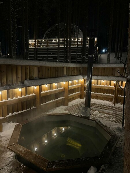 Горячий чан есть около домиков Лодж с купелью, Лесной у леса с купелью, Сфера с купелью.