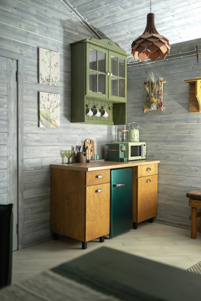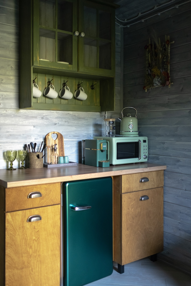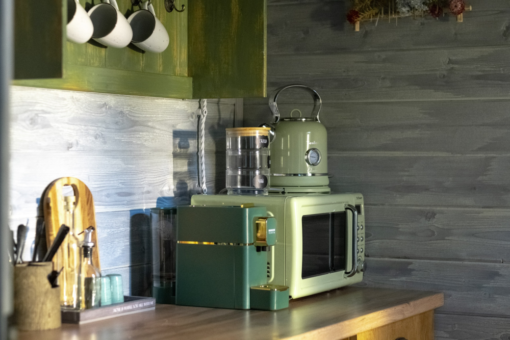 - Запасы для удобства: капсульный кофе, черный и зеленый чай, сахар, соль, перец, растительное масло, печенье.