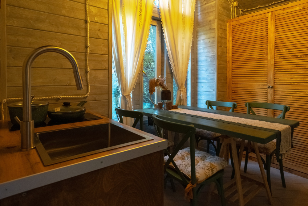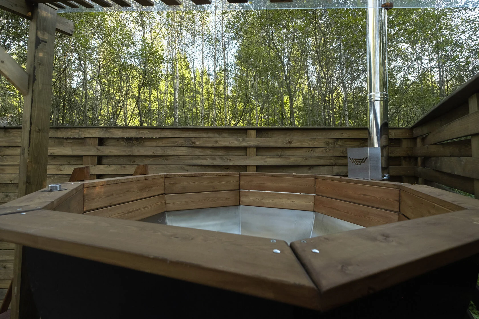 - Уединение и комфорт: Дом окружен отдельной территорией, что обеспечивает конфиденциальность. В каждом доме есть дворик с индивидуальной зоной для отдыха, барбекю и сибирским чаном-куплю для отдыха на свежем воздухе.