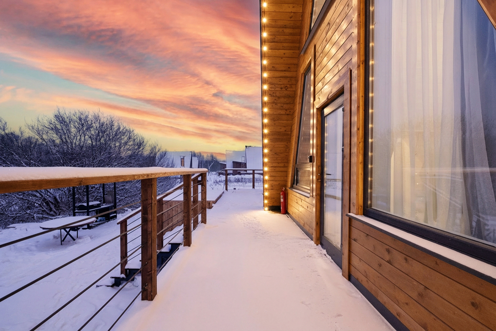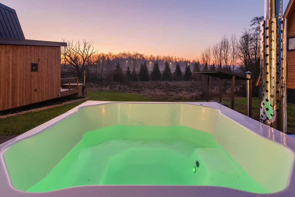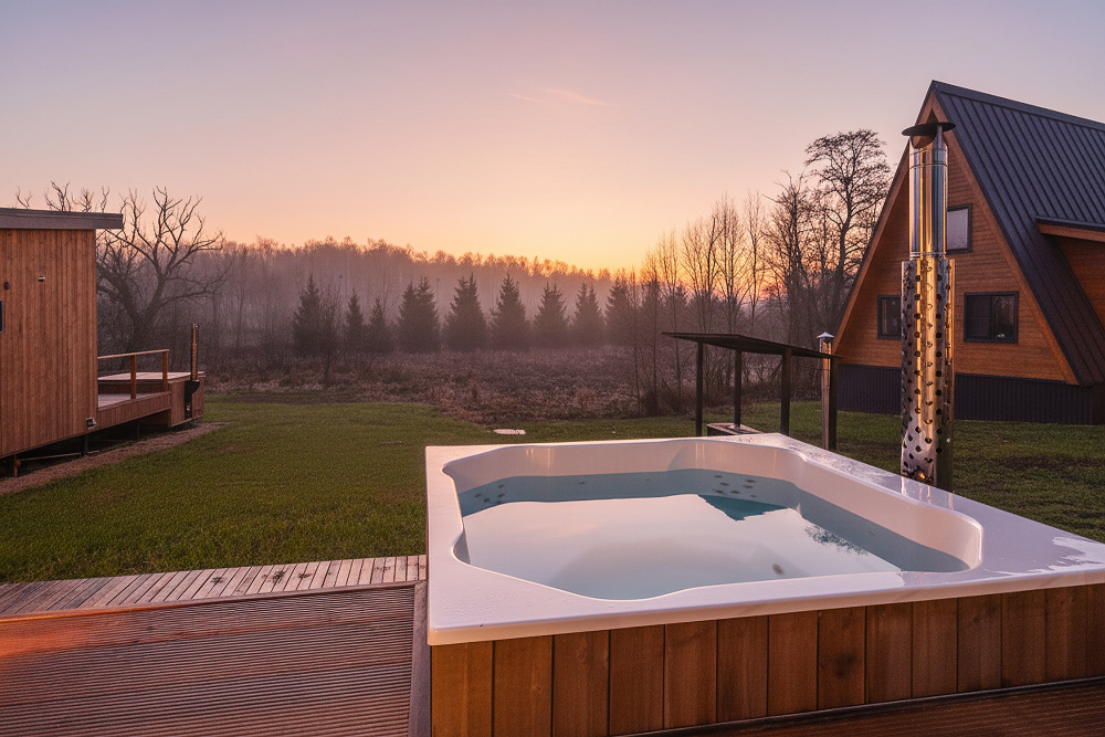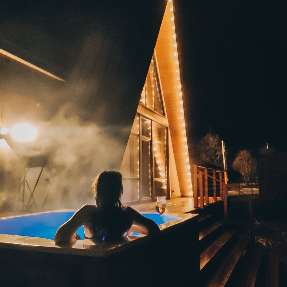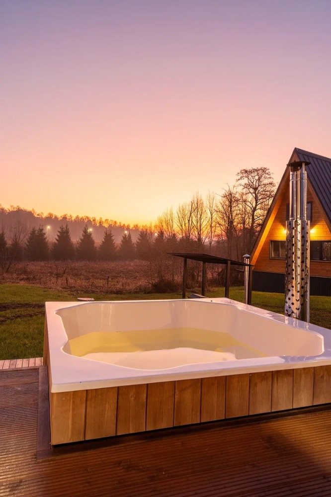 Горячий чан есть около домиков А-фрейм № 2 на 8 гостей, А-фрейм № 3 на 8 гостей, A-frame №4.