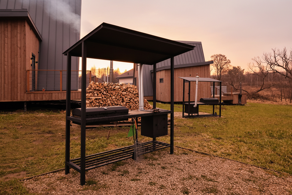 Мангальная зона есть около домиков А-фрейм № 2 на 8 гостей, А-фрейм № 3 на 8 гостей, A-frame №4.
