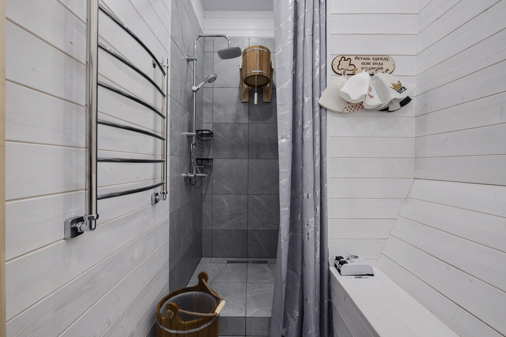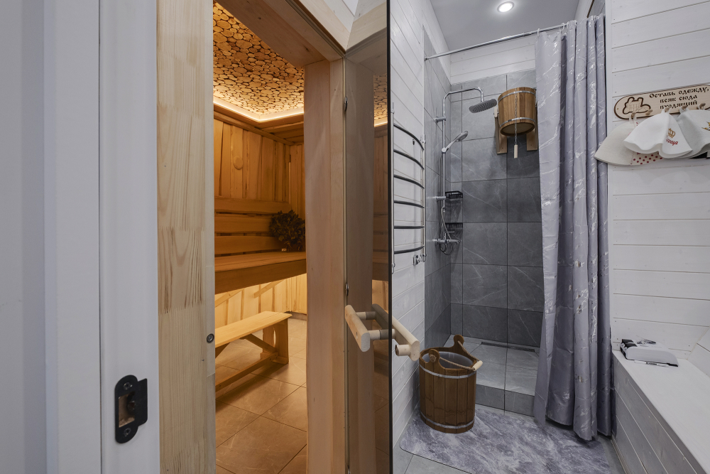 Баня есть около домиков А-фрейм № 2 на 8 гостей, А-фрейм № 3 на 8 гостей, A-frame №4.