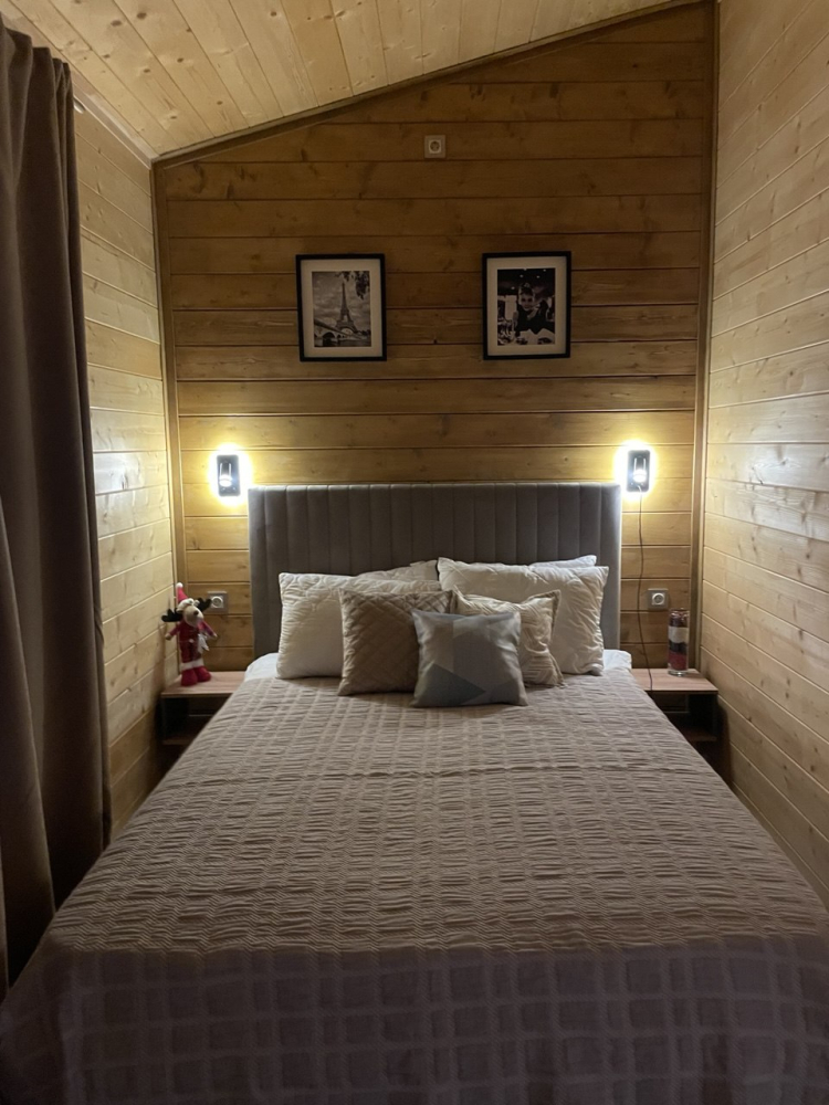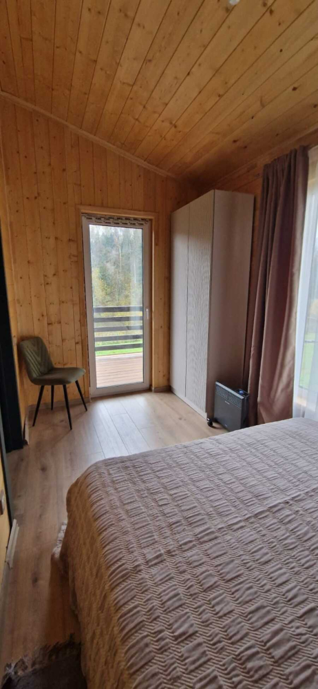 - Спальная комната с панорамными окнами и выходом на веранду и видом на лес