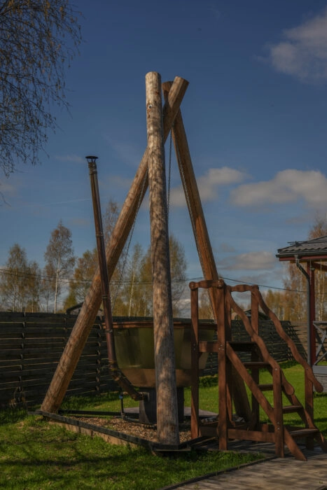 У каждого дома есть собственная купель. Вы наслаждаетесь свежим воздухом и горячей водой под открытым небом. Стоимость 5000р.