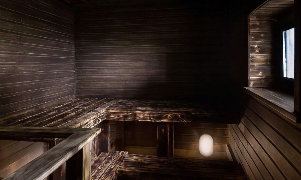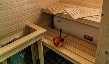 Сауна есть около домиков Вилла с сауной, Дом охотника с баней, Глемпинг с сауной на первой линии, Глемпинг с сауной, Глемпинг с отдельной спальней.