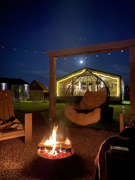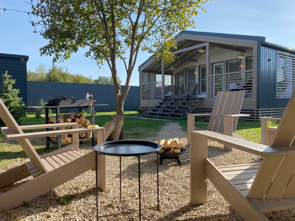 Рядом с каждым домиком есть личные установлены мангалы, зона костра, качели и кресла Адирондак