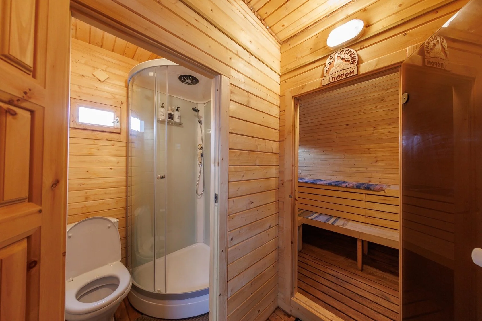 - имеется удобная душевая зона — все удобства расположены прямо внутри бани.