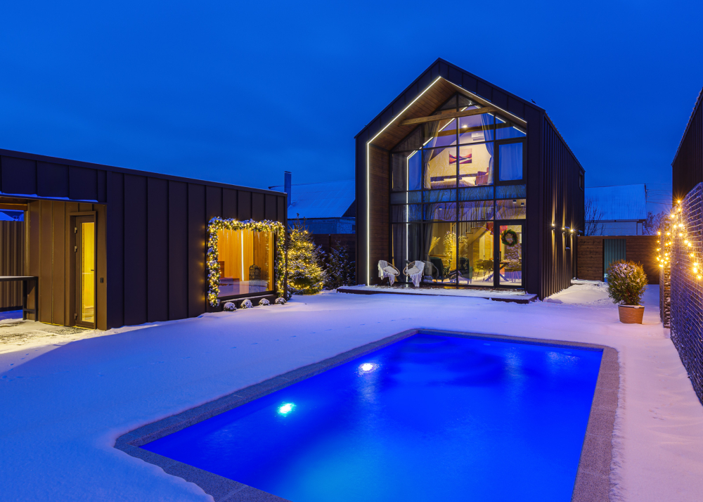 Всесезонный бассейн: размер 3х6 м, температура воды +30°C, стильная подсветка.