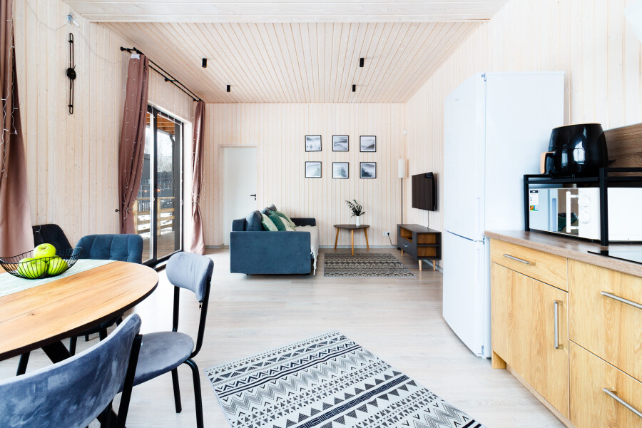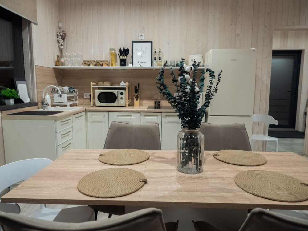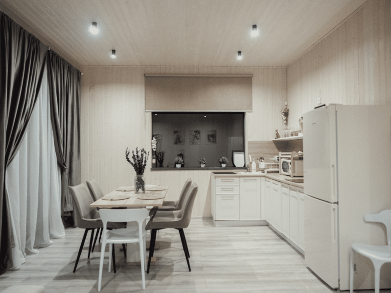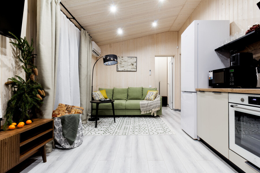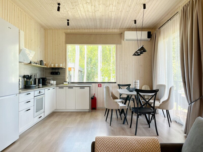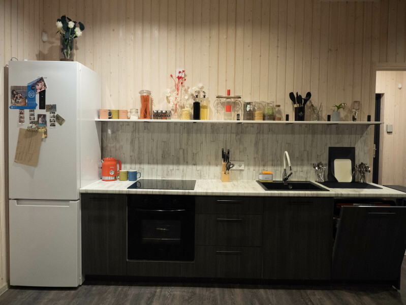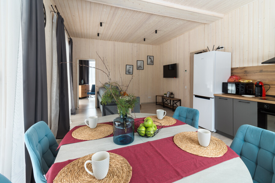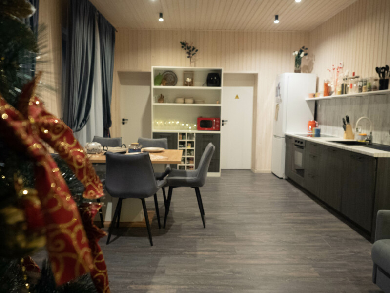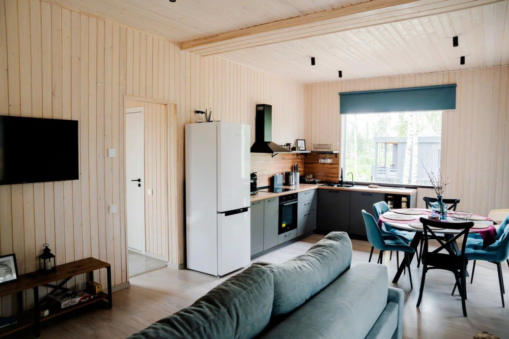 - Просторные кухни-гостиные: комфортные для больших компаний из 4+ человек, оснащены всем необходимым — плитой, духовкой, холодильником и посудой.