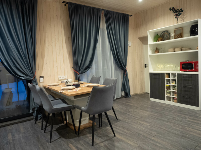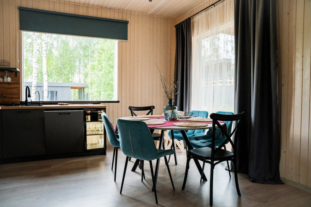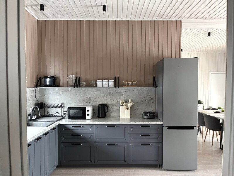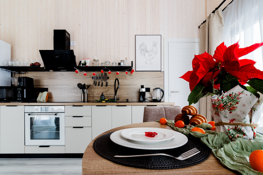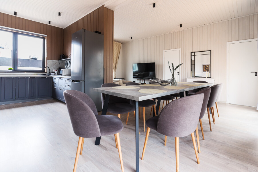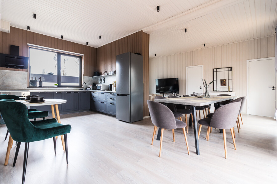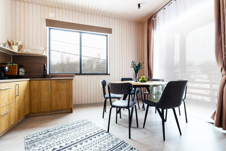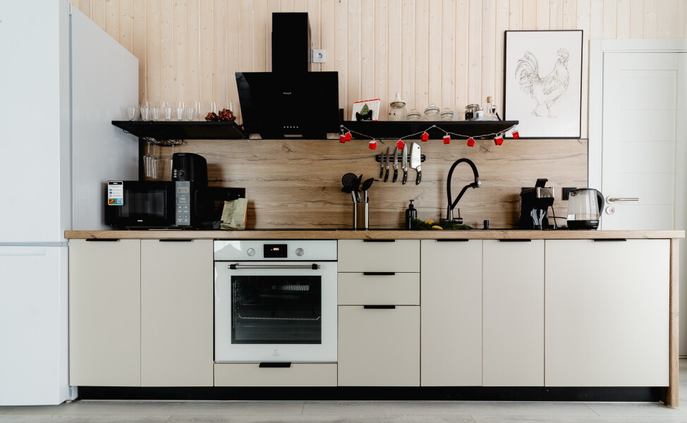 - Просторные кухни-гостиные: комфортные для больших компаний из 4+ человек, оснащены всем необходимым — плитой, духовкой, холодильником и посудой.