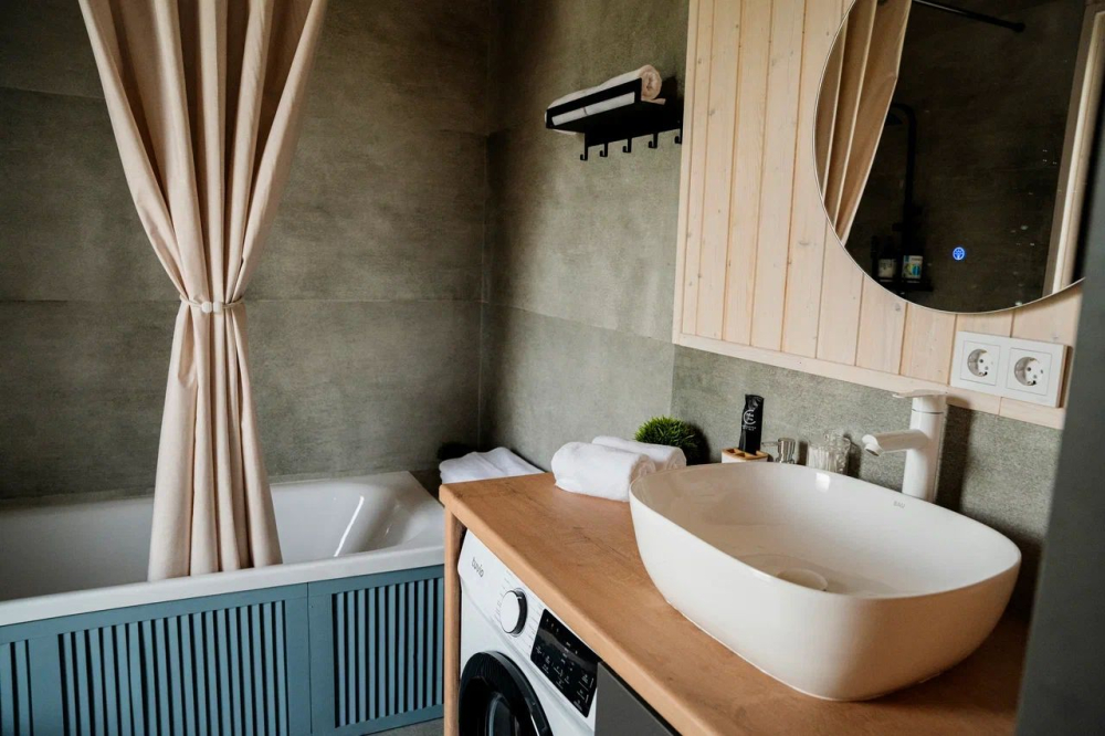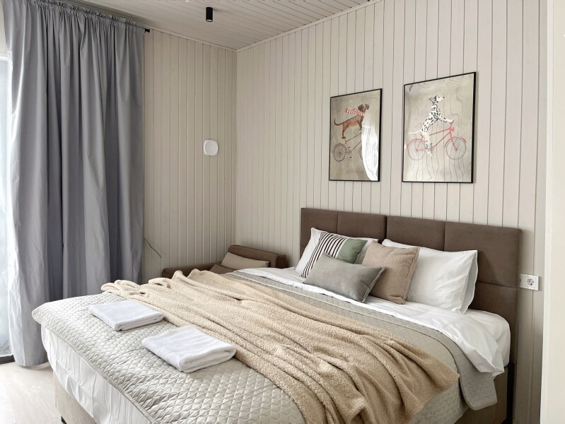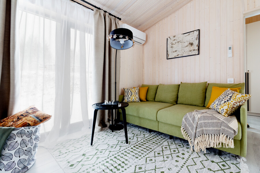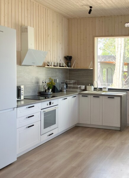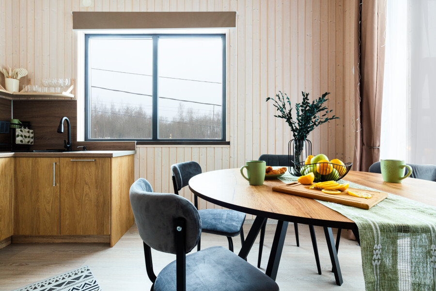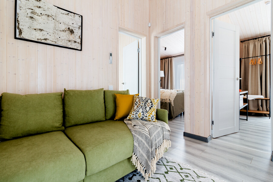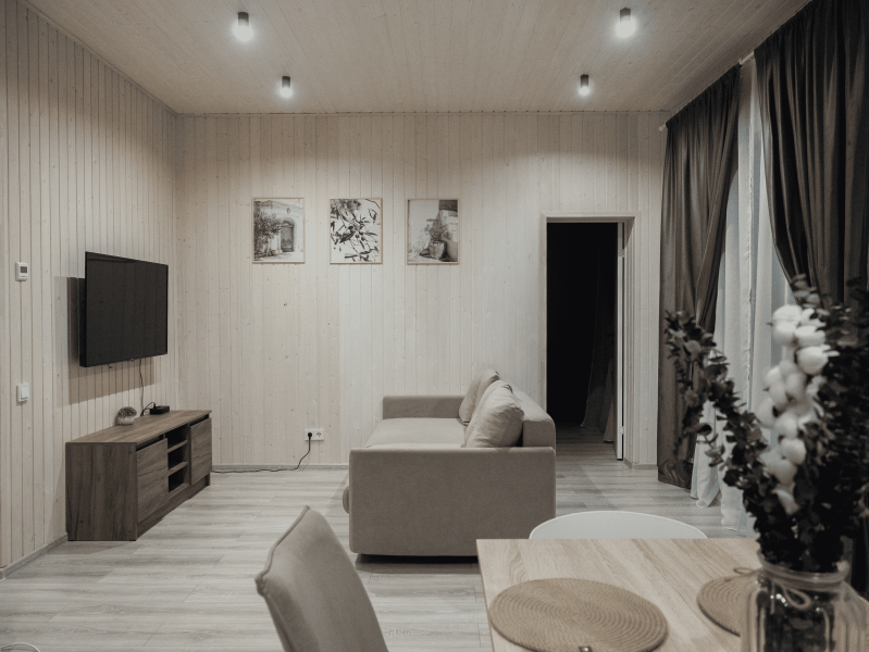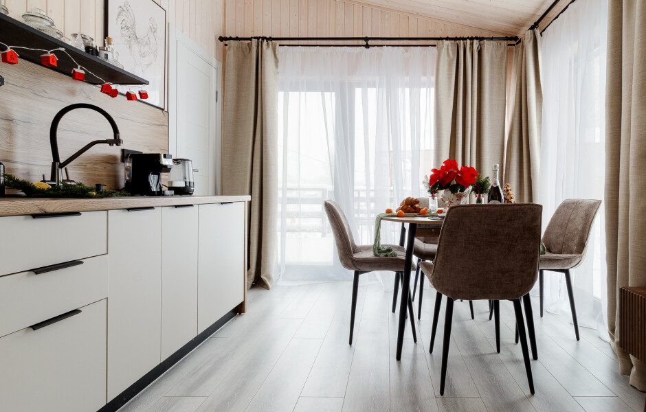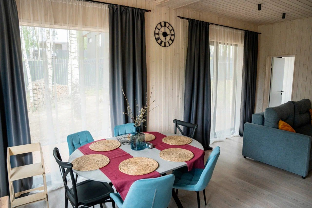 - Просторные кухни-гостиные: комфортные для больших компаний из 4+ человек, оснащены всем необходимым — плитой, духовкой, холодильником и посудой.