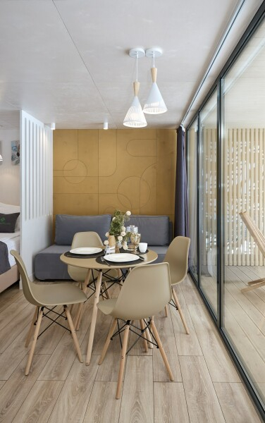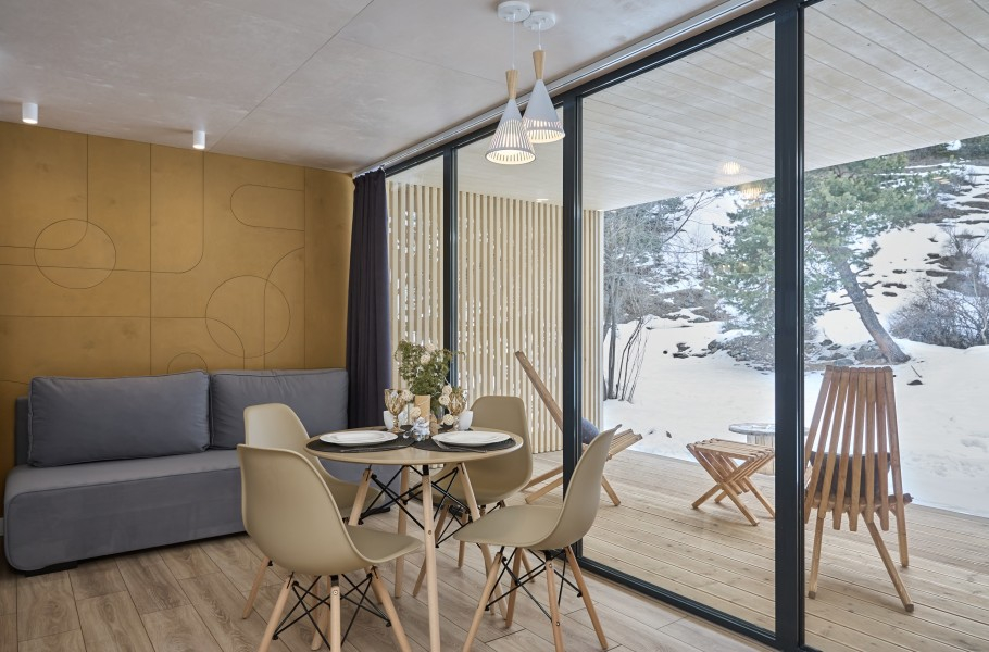 - Комфорт и уют : каждое шале оборудовано ортопедической кроватью King-size и уютным диваном — для спокойного и крепкого сна.