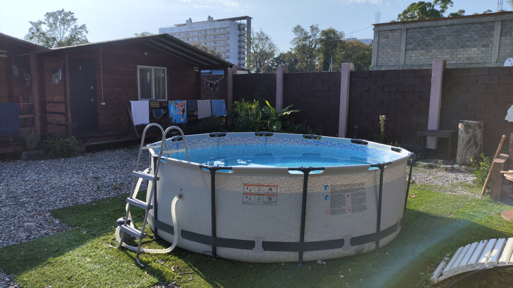 Наш гостеприимный двор полон радостей и развлечений: вот большой каркасный бассейн, готовый охладить вас после дневного зноя, а просторная терраса ждет веселых застолий и душевных бесед. Парковка совершенно бесплатна, ваша железная лошадь будет находиться в полном комфорте и безопасности. Летняя кухня обустроена таким образом, чтобы каждое блюдо стало настоящим шедевром гастрономического искусства: СВЧ печь, электрическая плита, разнообразная кухонная утварь и дополнительная техника позволят создать любое угощение, а мангал, полный углей и принадлежности для барбекю, обеспечит отменный шашлык, ставший символом кавказского гостеприимства.