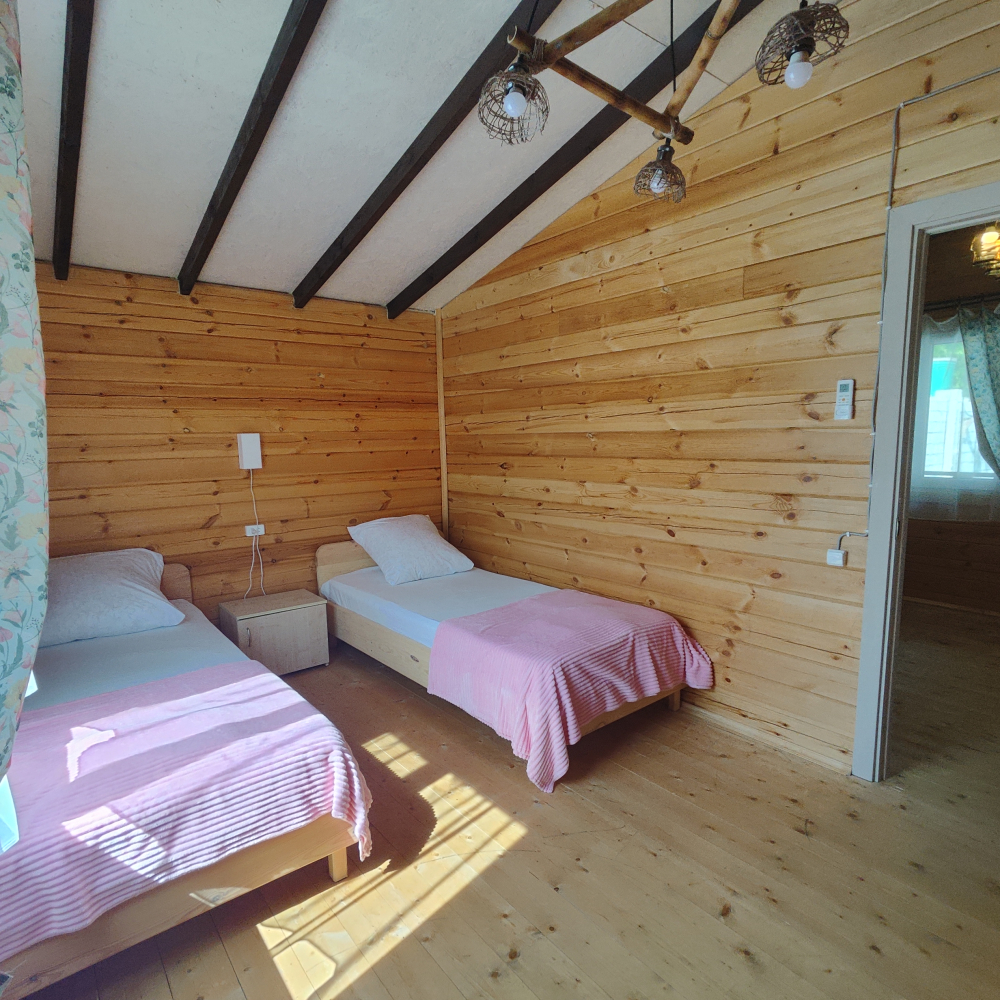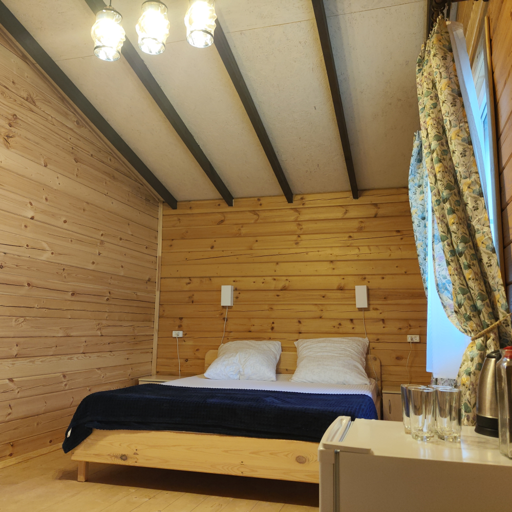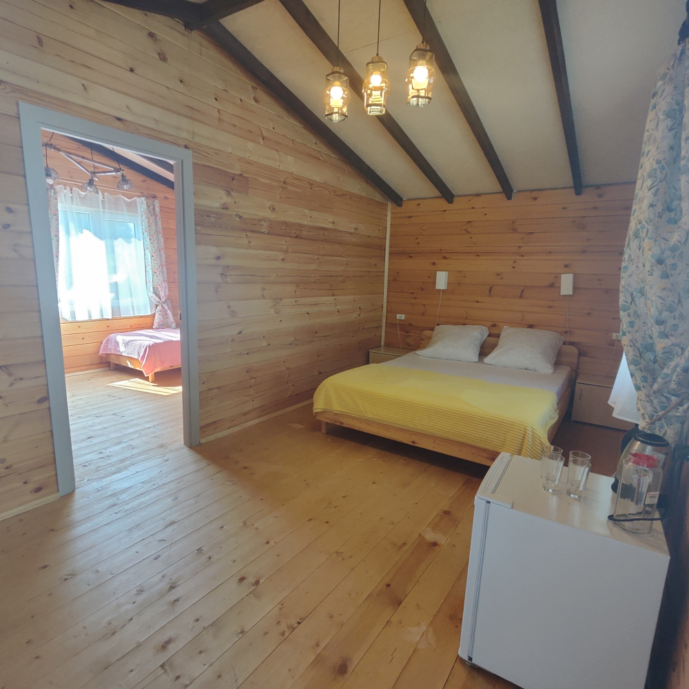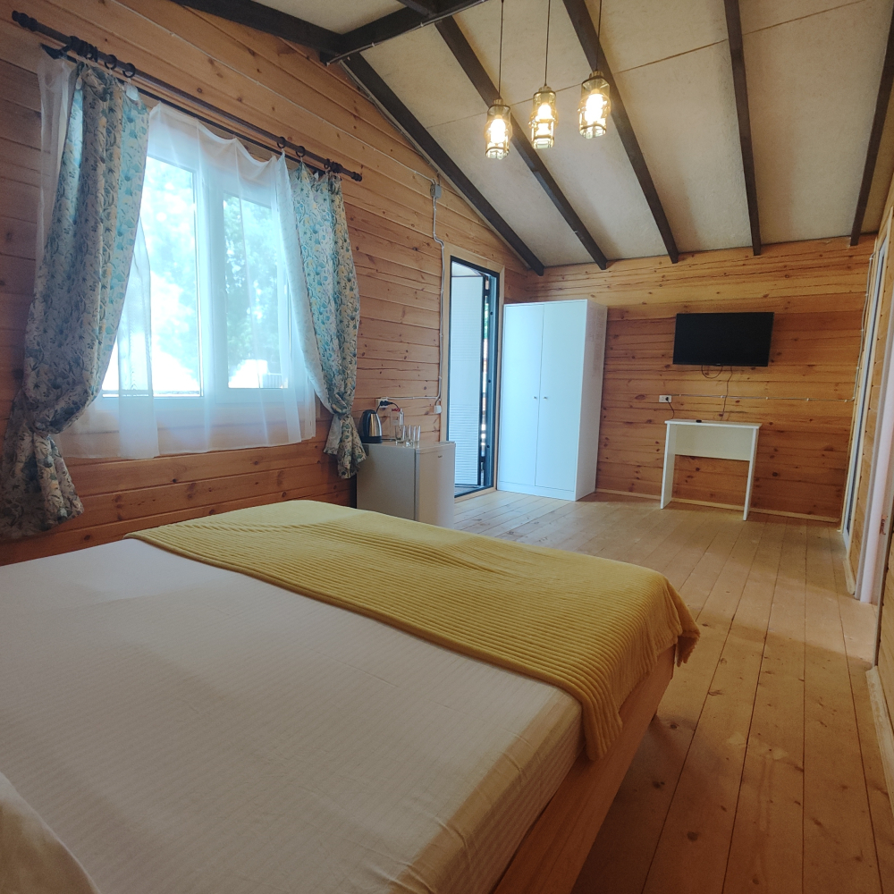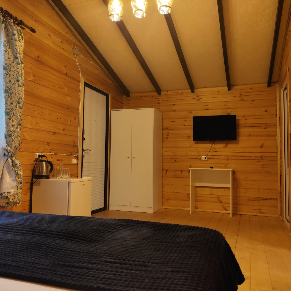 Каждый гость найдет здесь достойное жилище — светлые и удобные деревянные домики, выполненные с любовью и теплотой истинных мастеров, способные вместить дружную компанию до шести человек. Санузел, телевидение, кондиционер, холодильник, бесплатный Wi-Fi, электрический чайник и даже фен ждут вас внутри каждого домика, создавая полную гармонию удобства и комфорта.