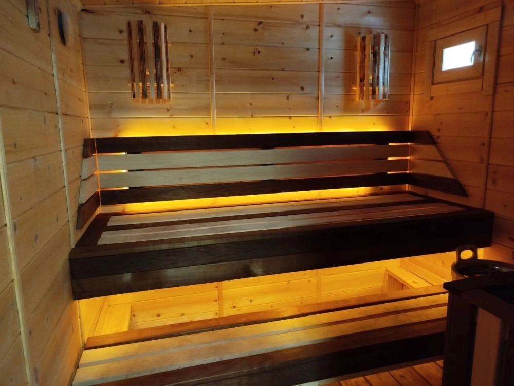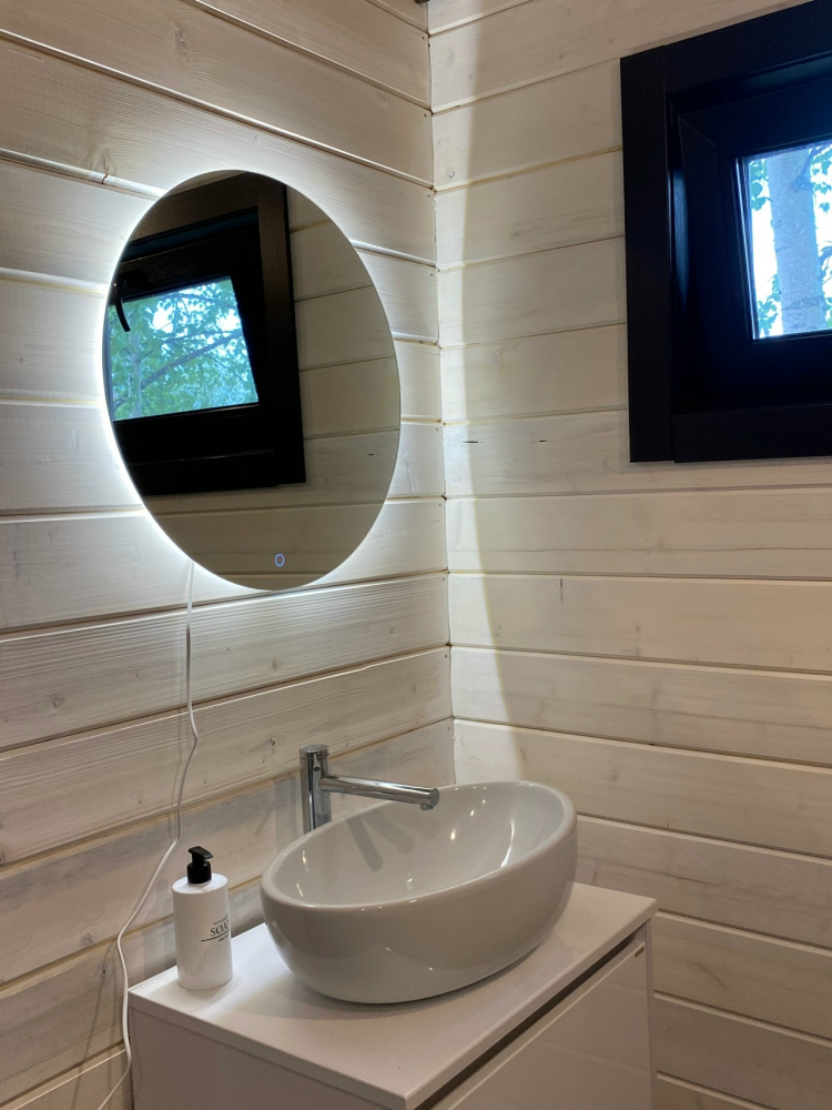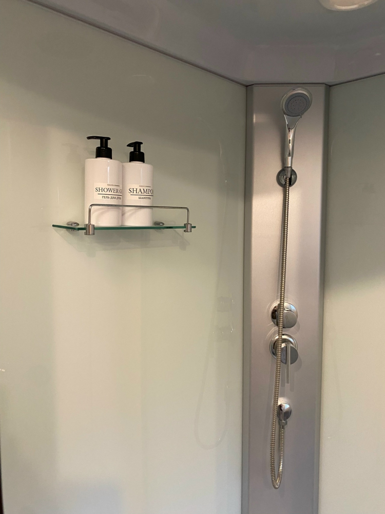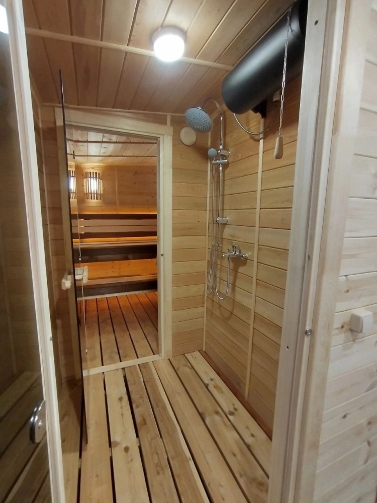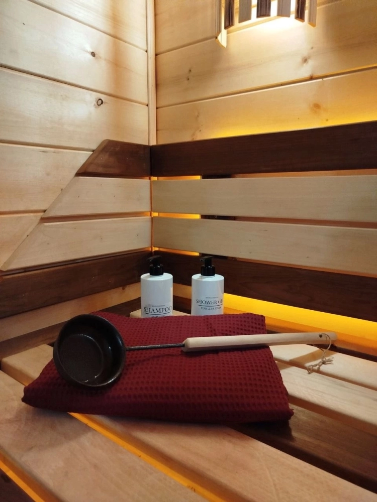 В бане есть все необходимое: масла для парения, душ, простыни, тапочки, шампуни и, конечно, место отдыха