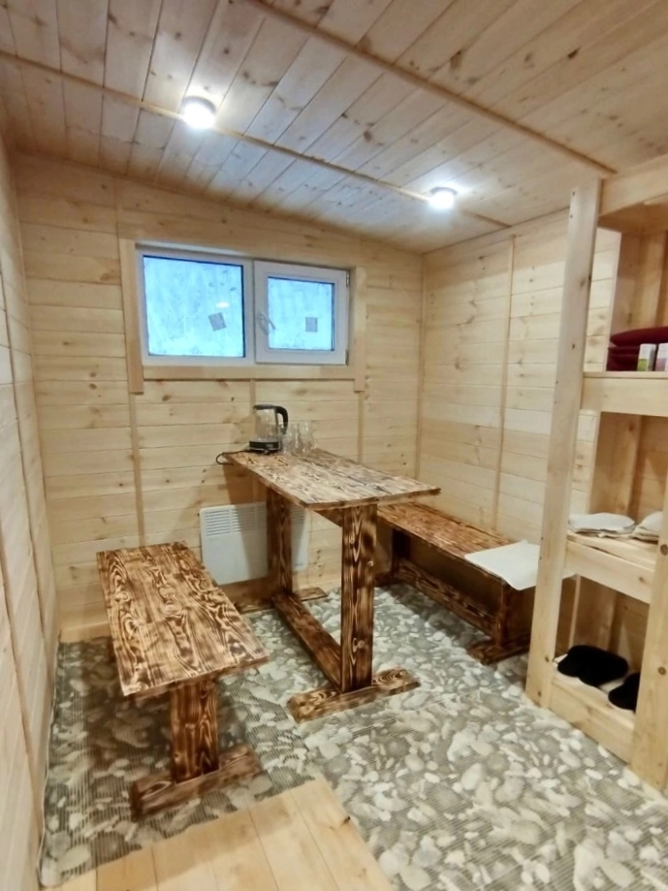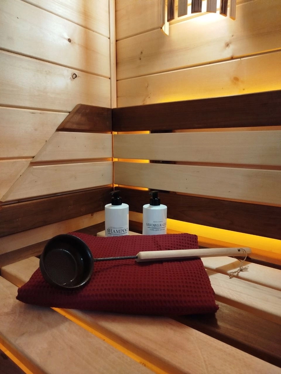 В бане есть все необходимое: масла для парения, душ, простыни, тапочки, шампуни и, конечно, место отдыха