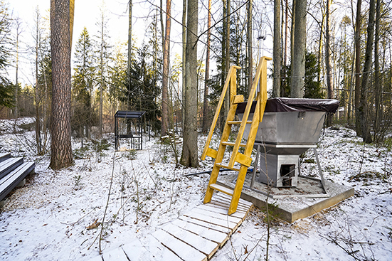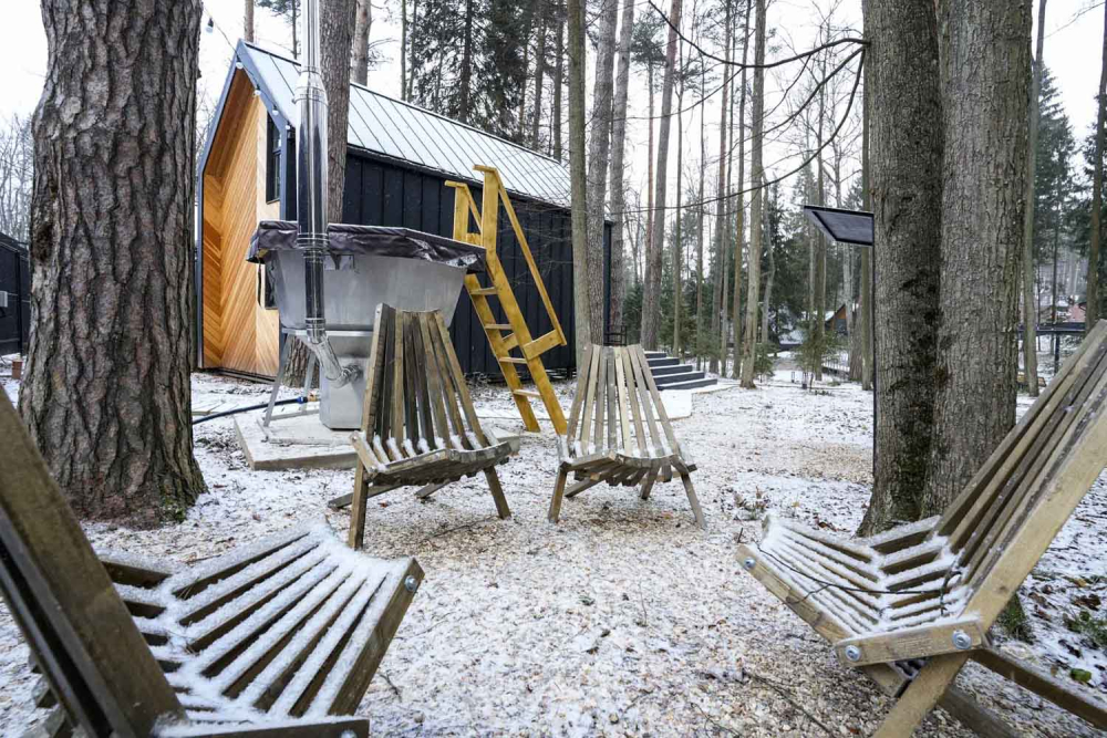 Сауна есть около домиков БарнХаус 5 с сауной, Панорамный домик с сауной.