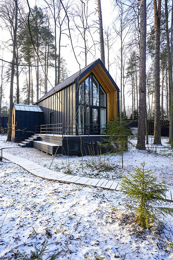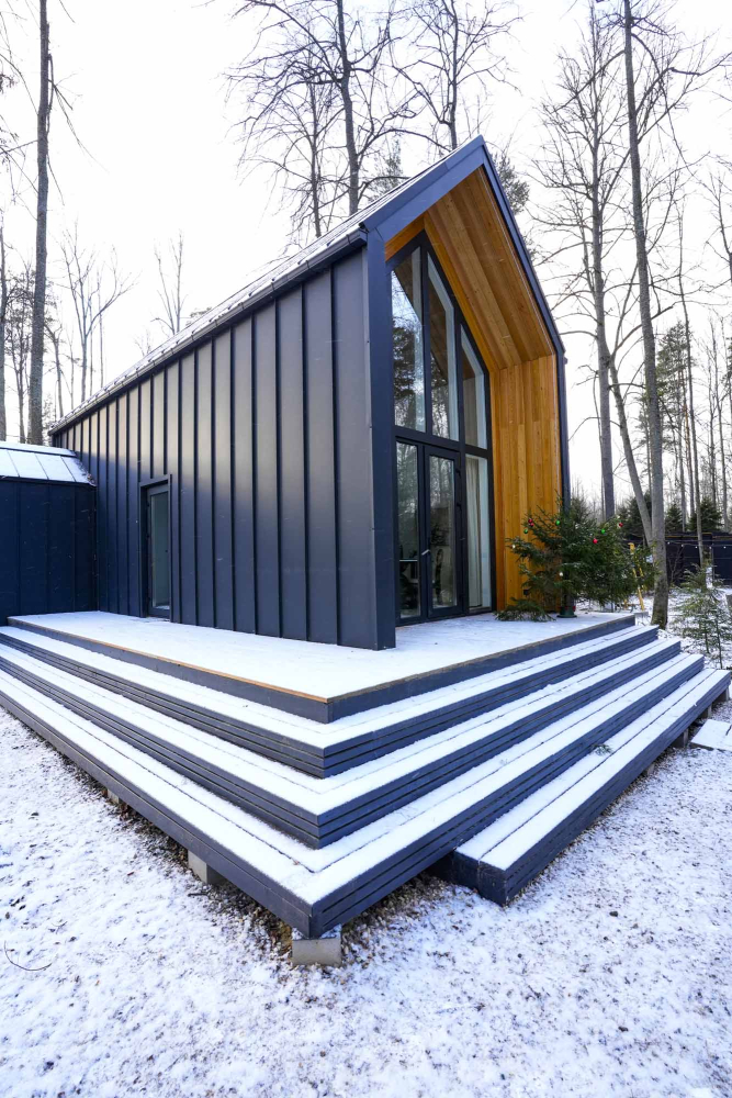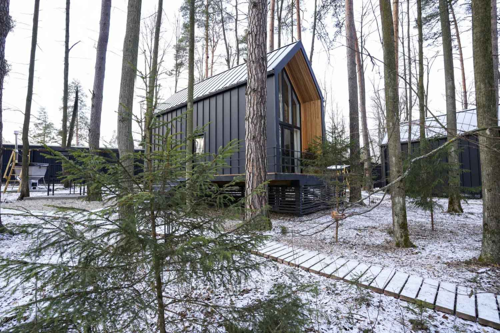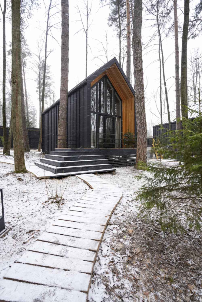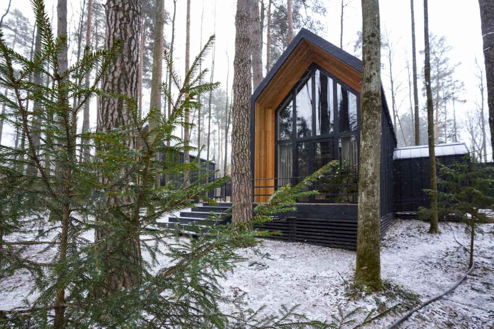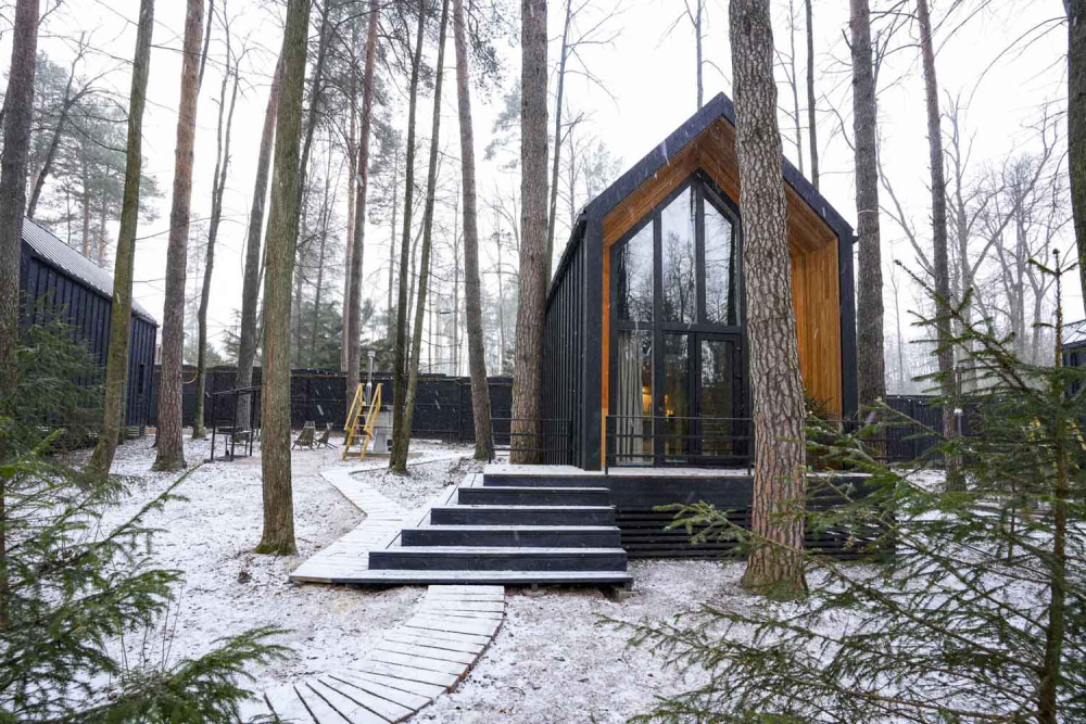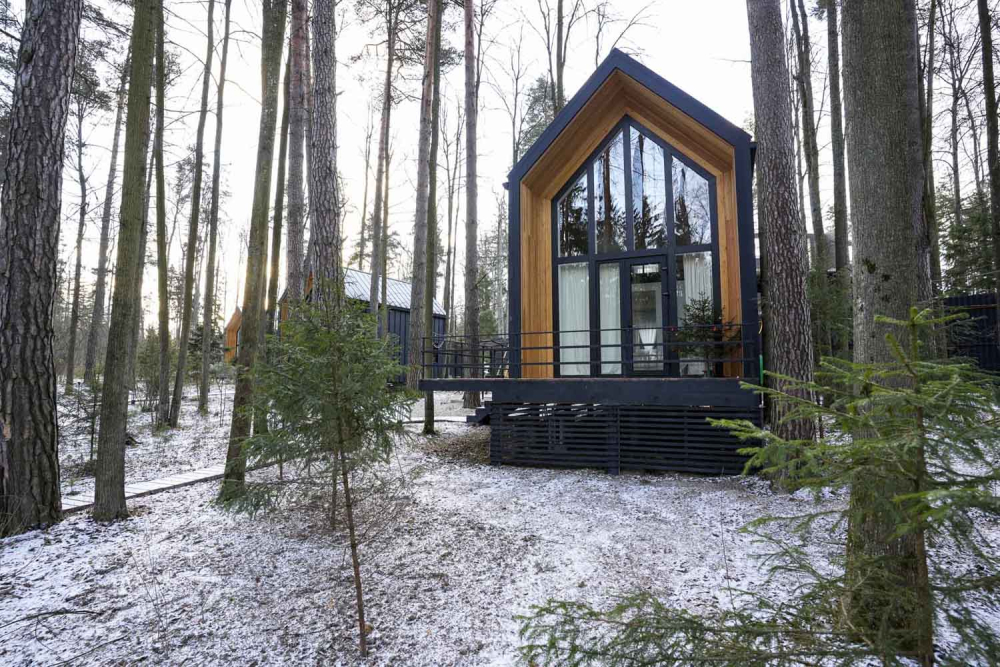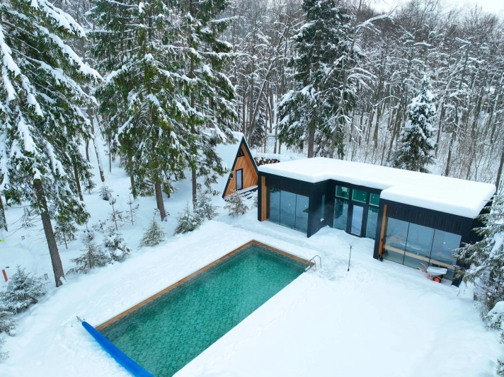 Современные дома и подогреваемый бассейн в окружении сосен