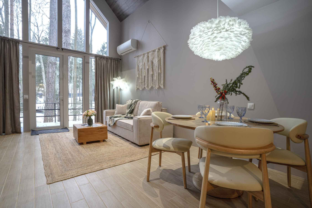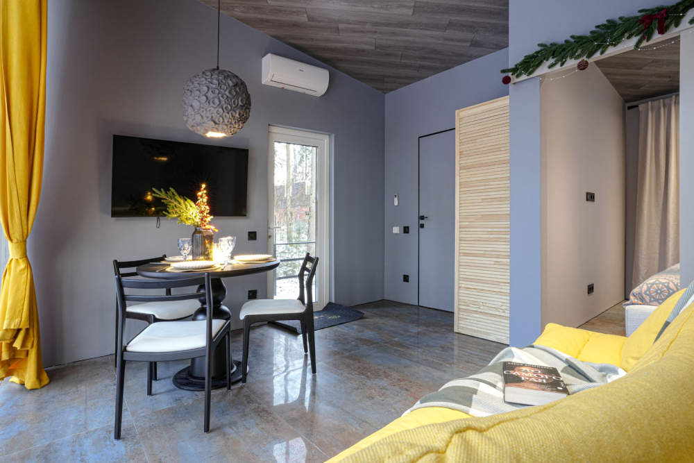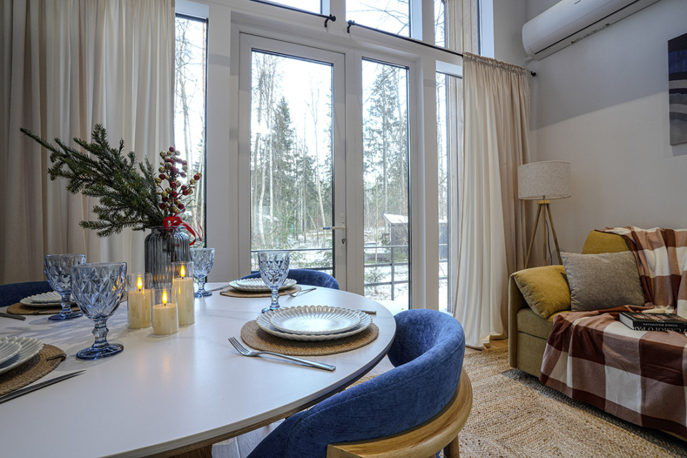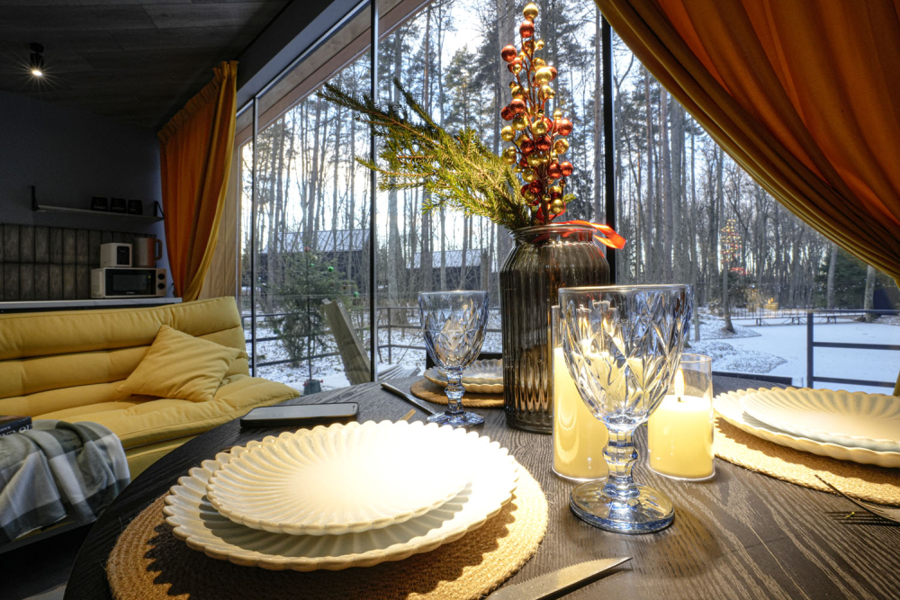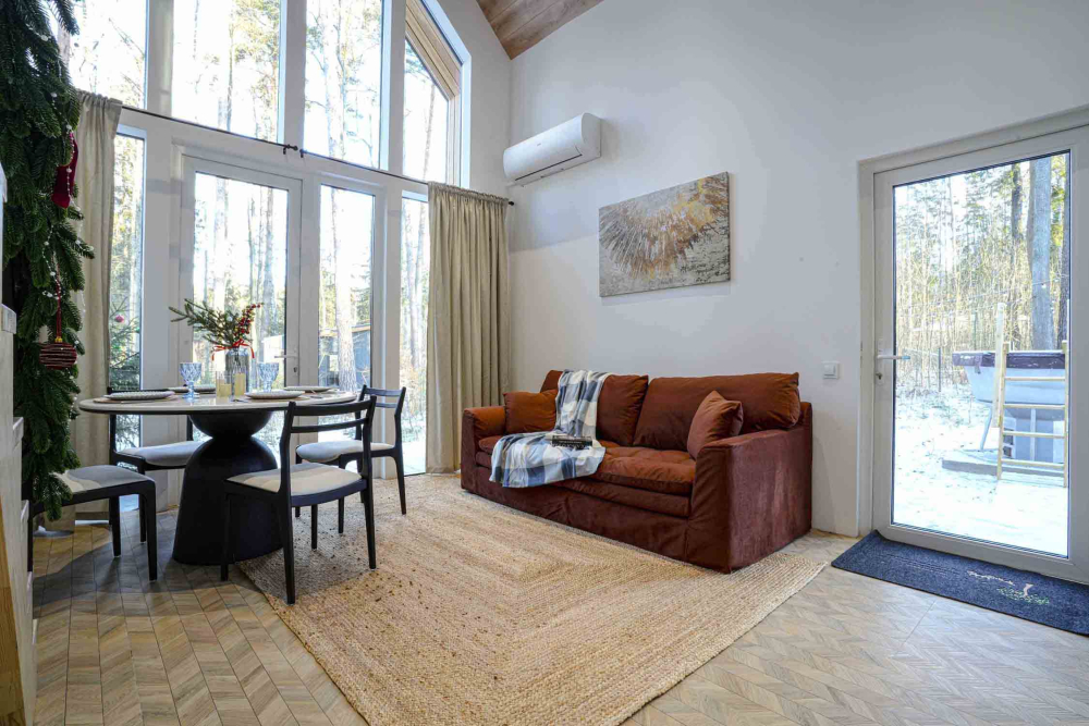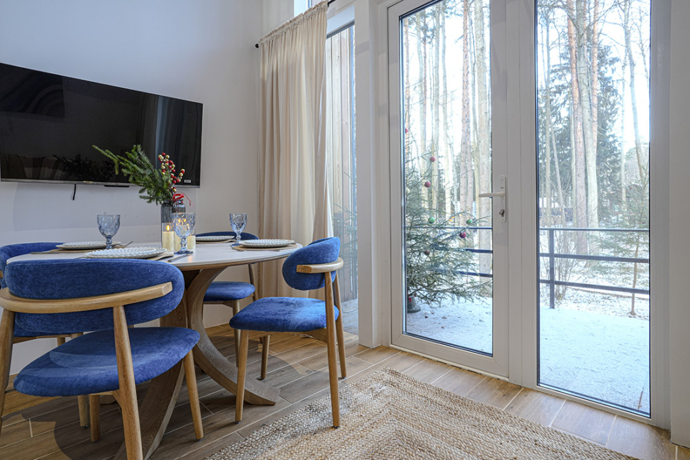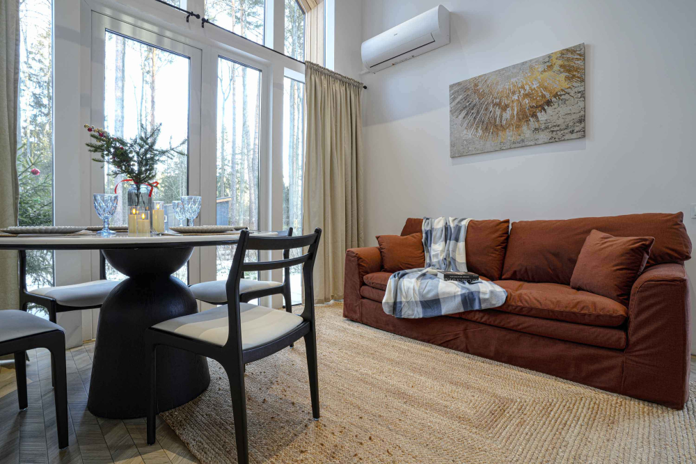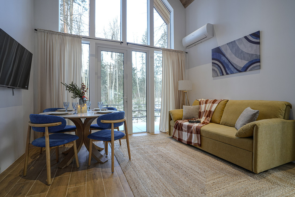 Каждый дом полностью укомплектован современной мебелью и техникой. Выполнен стильный дизайнерский ремонт, созданы уютные интерьеры, в которых комфортно в любое время года. Вам не нужно ни о чём заботиться — просто приезжайте и наслаждайтесь отдыхом.