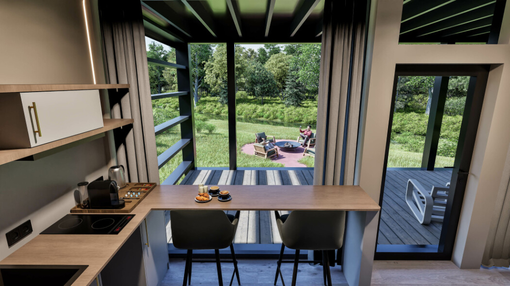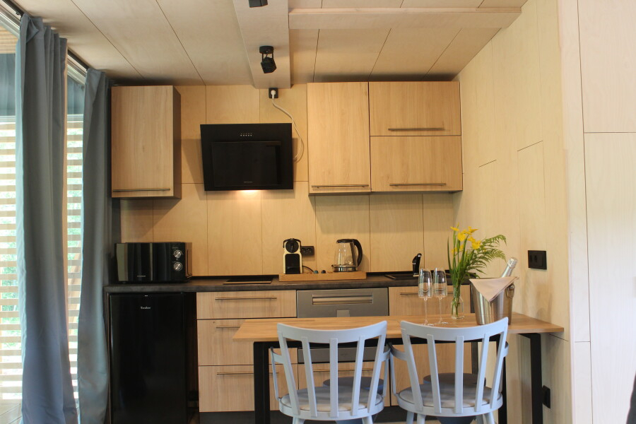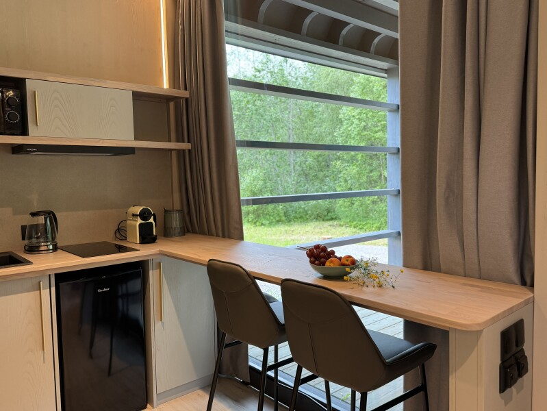 - Каждый домик оборудован кофе-машиной, чайником и полностью оборудованной кухней .