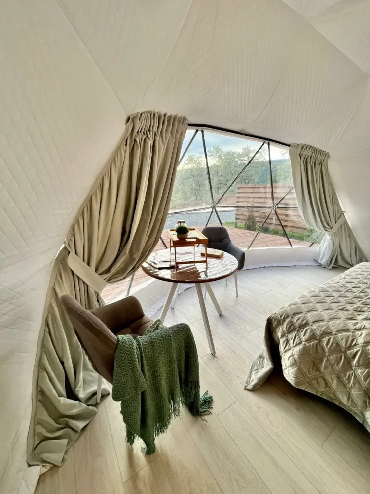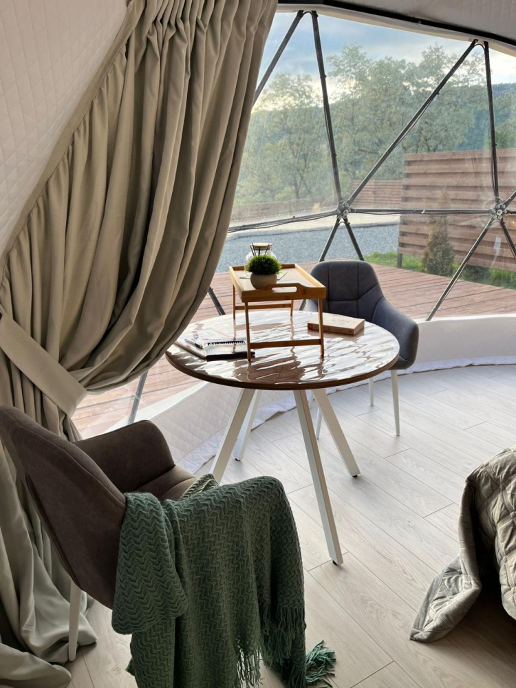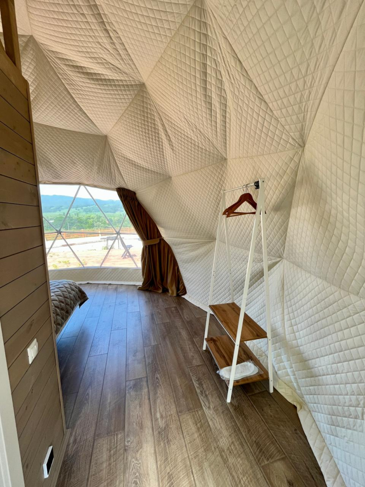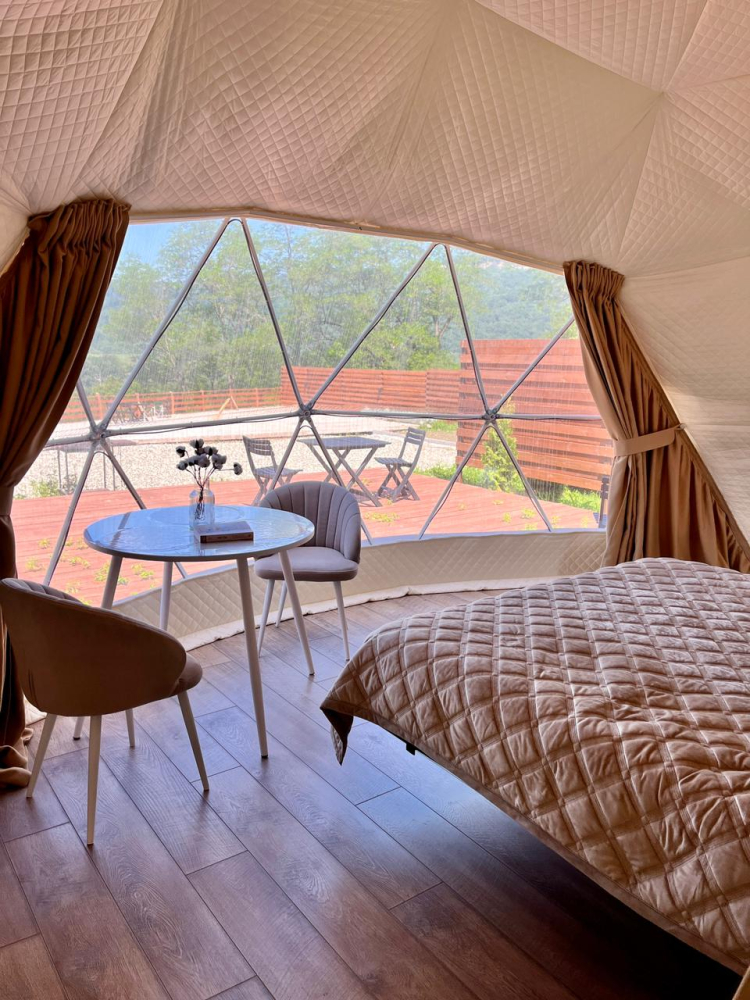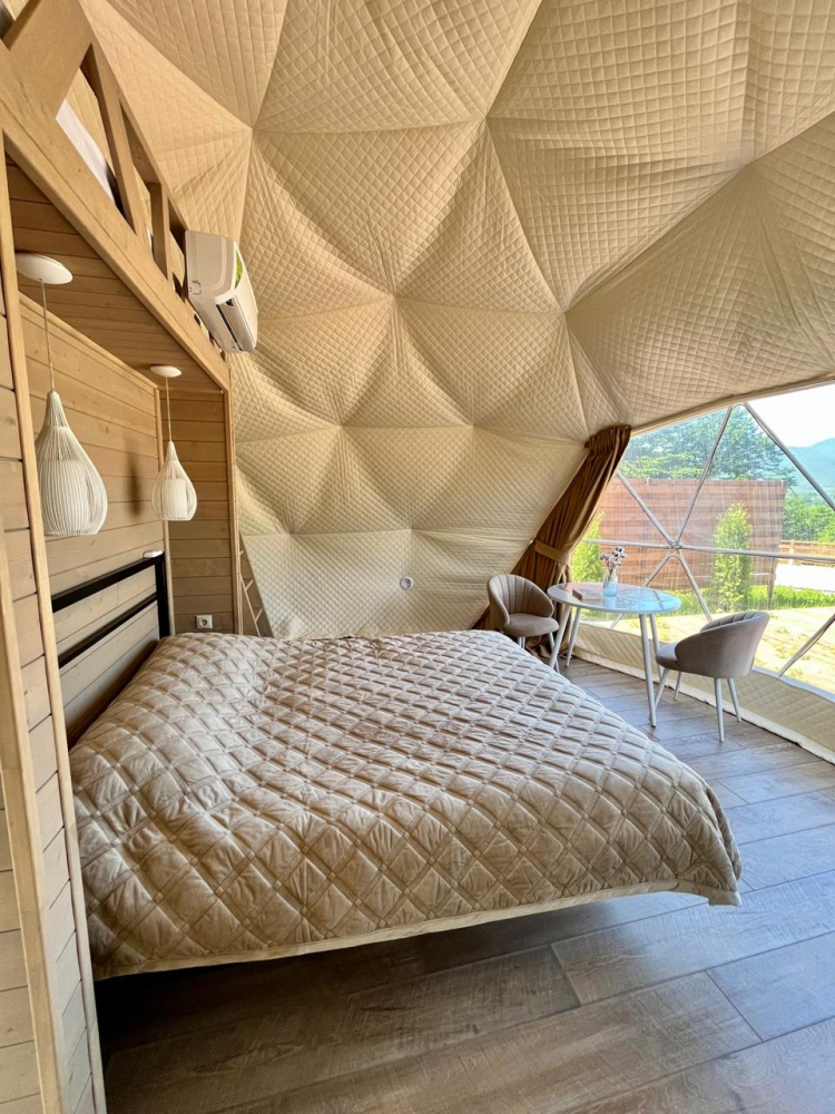 На территории расположены три отдельно стоящие дома-сферы, выстроенные в одну линию с захватывающим видом на горы и реку Белая. Каждая сфера выполнена в своем стиле — эко, классика и лофт, что позволяет выбрать атмосферу по настроению.