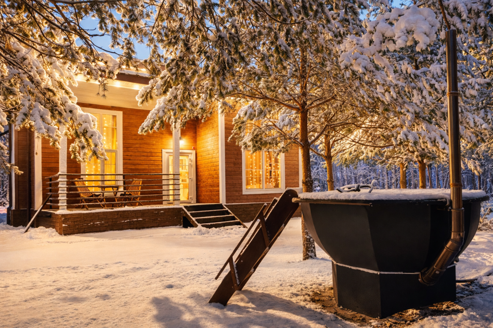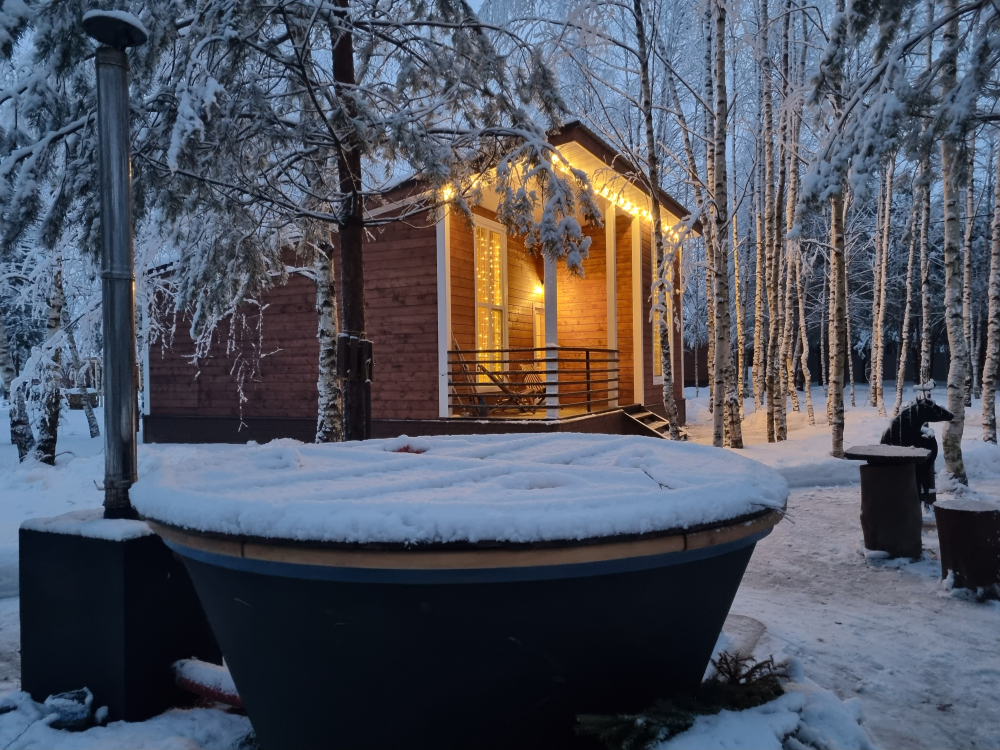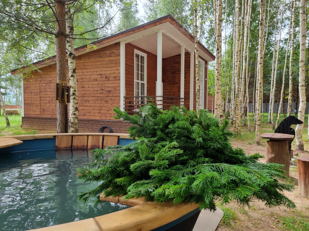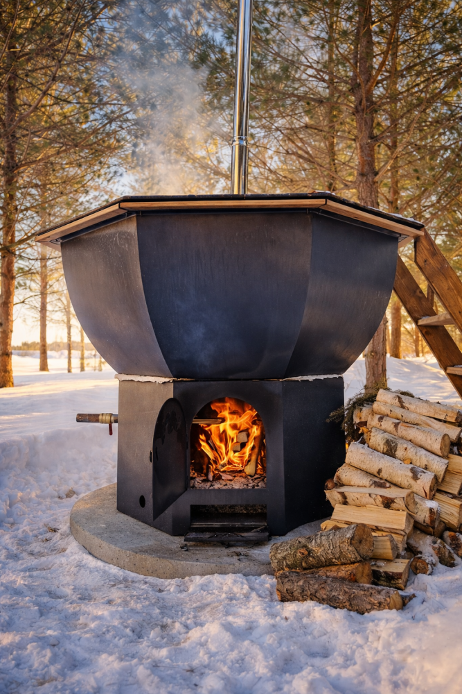 Настоящее удовольствие — чан с мягкой водой, нагретой до 38–40° на берёзовых дровах. Добавим травяные запарки или пихтовые веники для особой атмосферы.