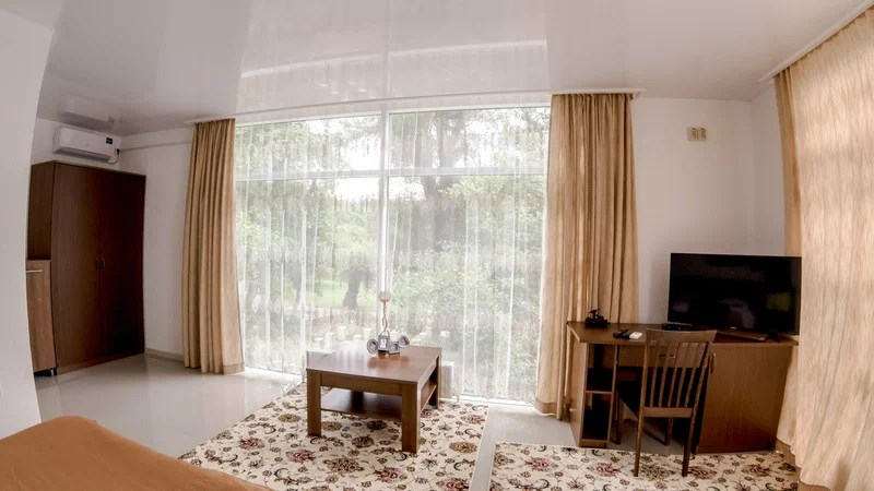 Есть номера с общей просторной верандой на два номера, а также варианты с собственной верандой. При этом у каждого номера отдельный вход, свой санузел, душ, телевизор, чайник, холодильник, кондиционер и обогреватель.