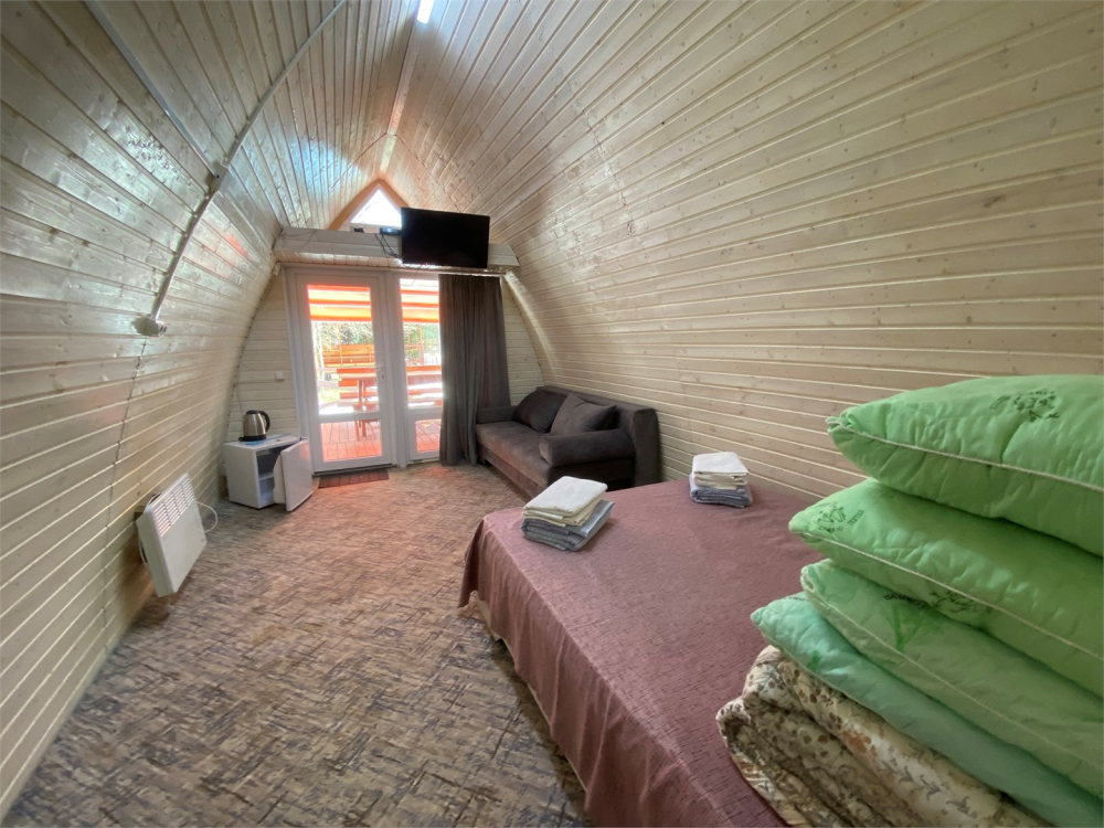 Рядом находится мангальная зона, а также зелёная полянка, на которой можно играть в футбол и другие активные игры. Гости могут пользоваться общей кухней: на ней есть плита и микроволновка, а в самом номере — чайник и холодильник.