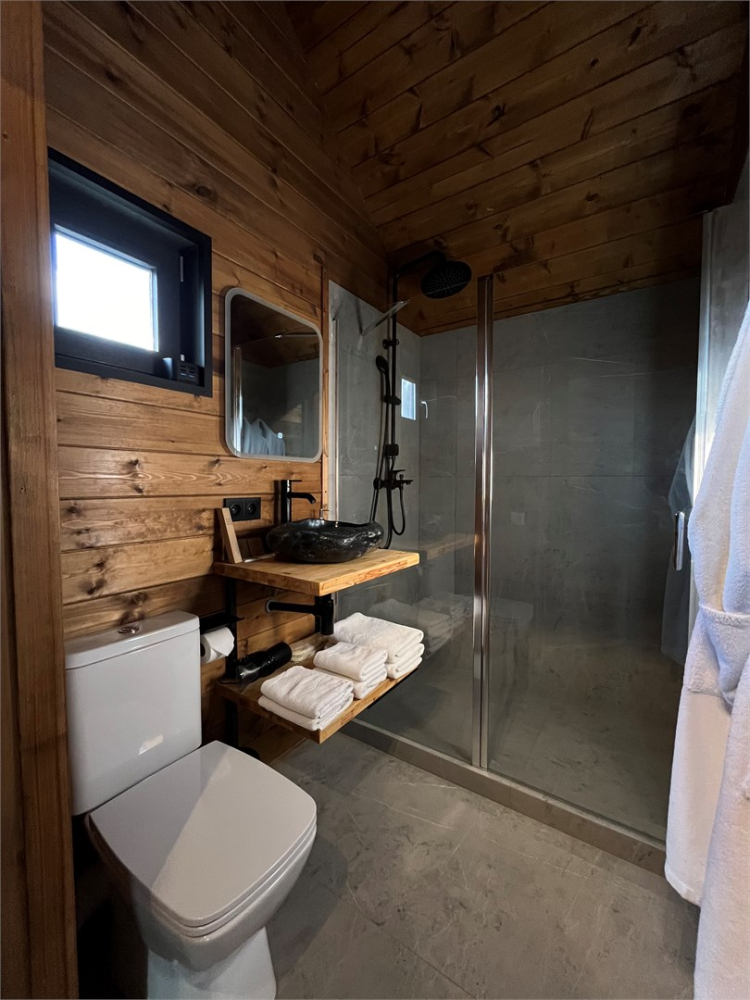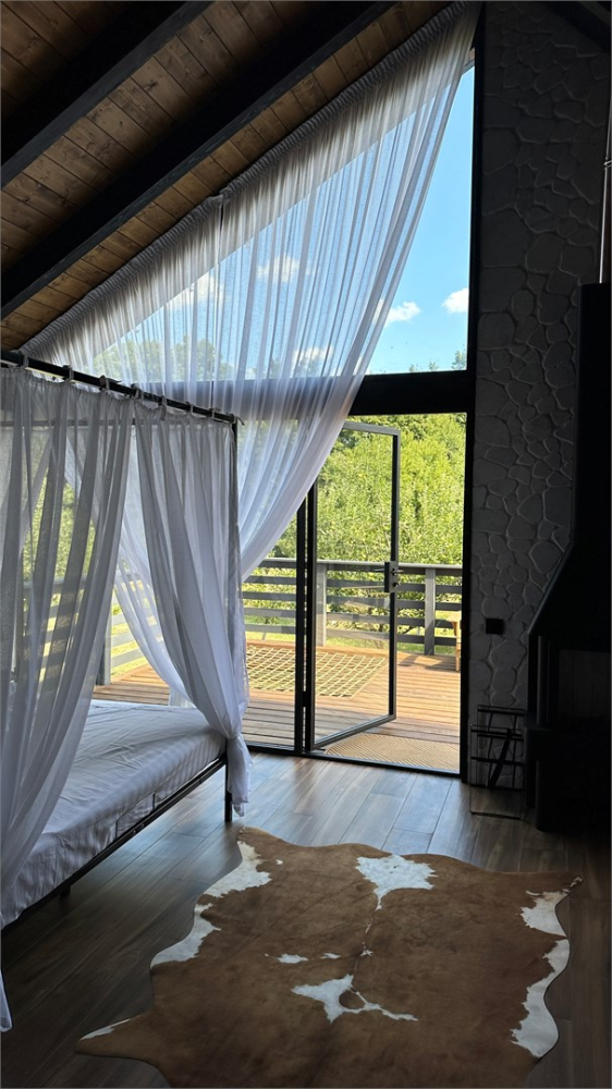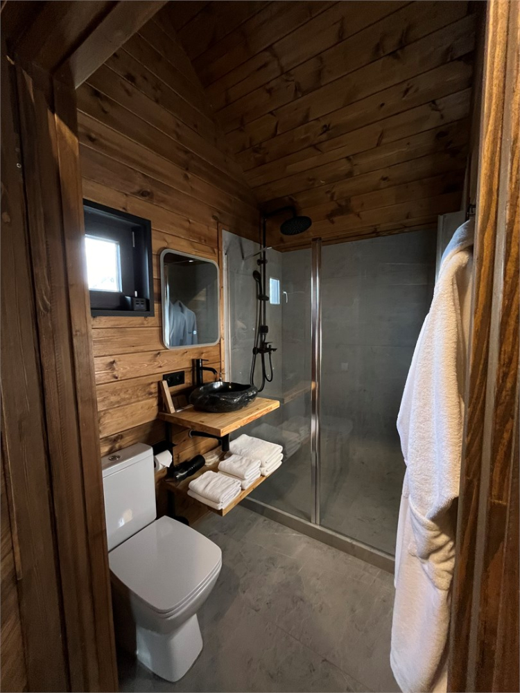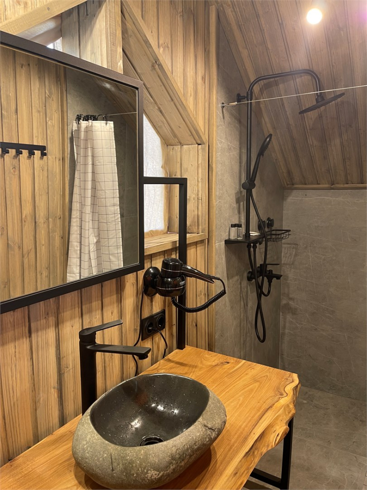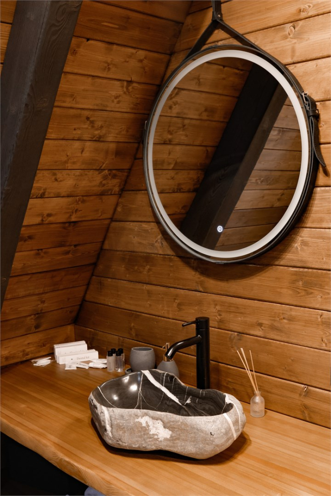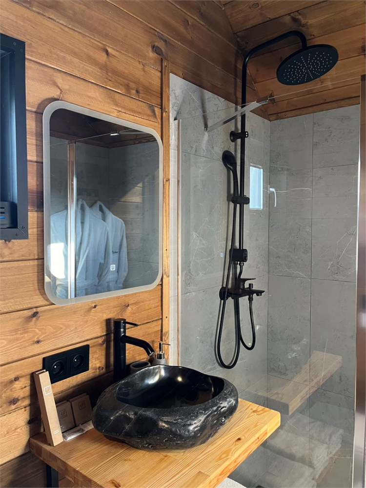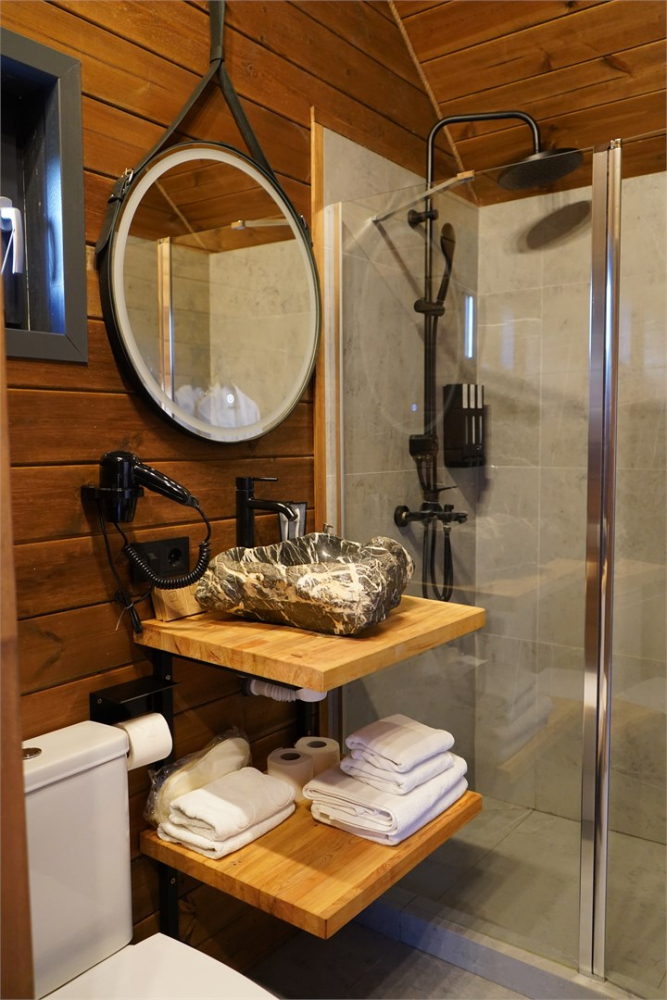 японская бочка фурако и гамак на террасе, два шезлонга и зонт от солнца, BQ-зона, индивидуальная костровая зона, раскладной диван и кресло, детская кроватка по запросу, двуспальная кровать, ванная с панорамным видом, уютный камин, TV, Wi-Fi, холодильник, чайник, капсульная кофемашина, набор посуды, приборы, бокалы, санузел с душевой, халат/ тапочки/ полотенца, косметические наборы, зонты, в случае дождливой погоды, отопление (теплый пол, кондиционер, обогрев на кровати)