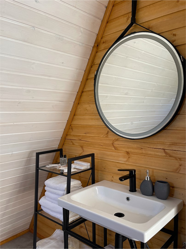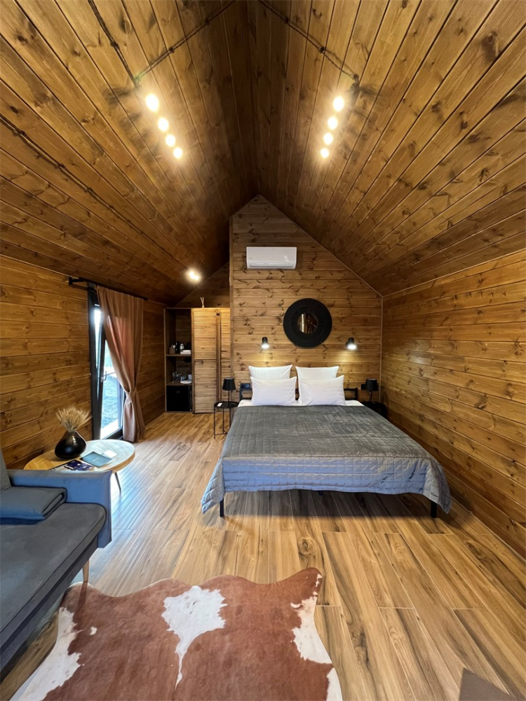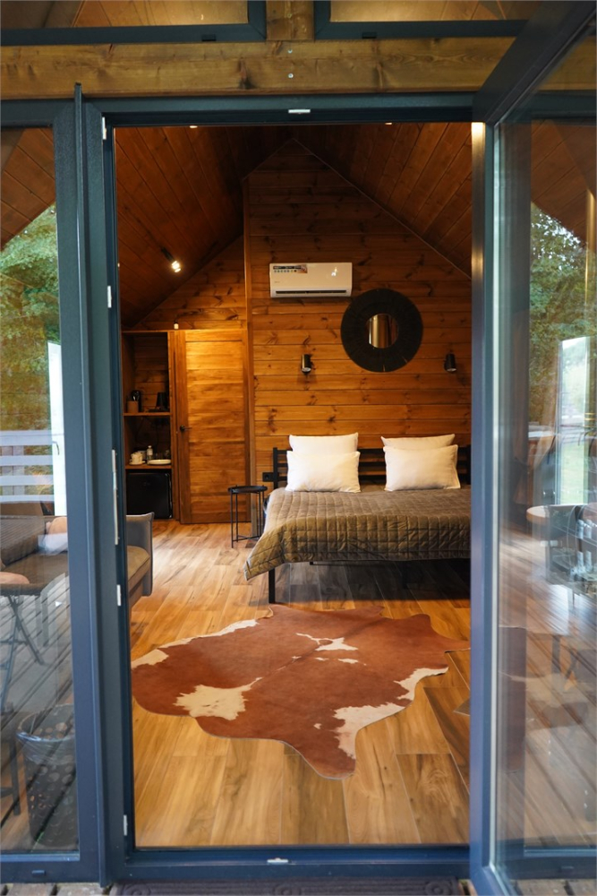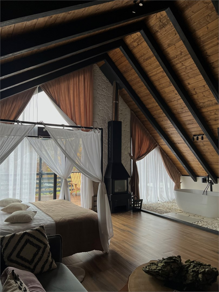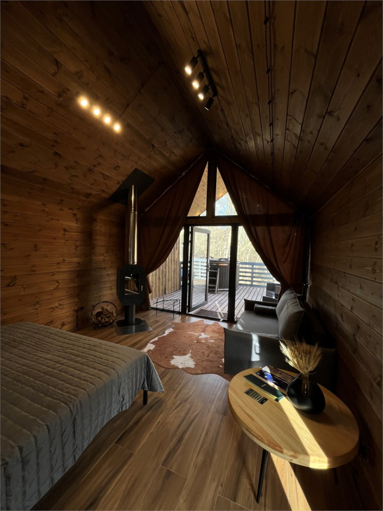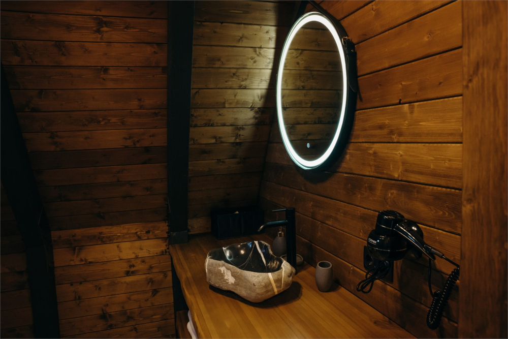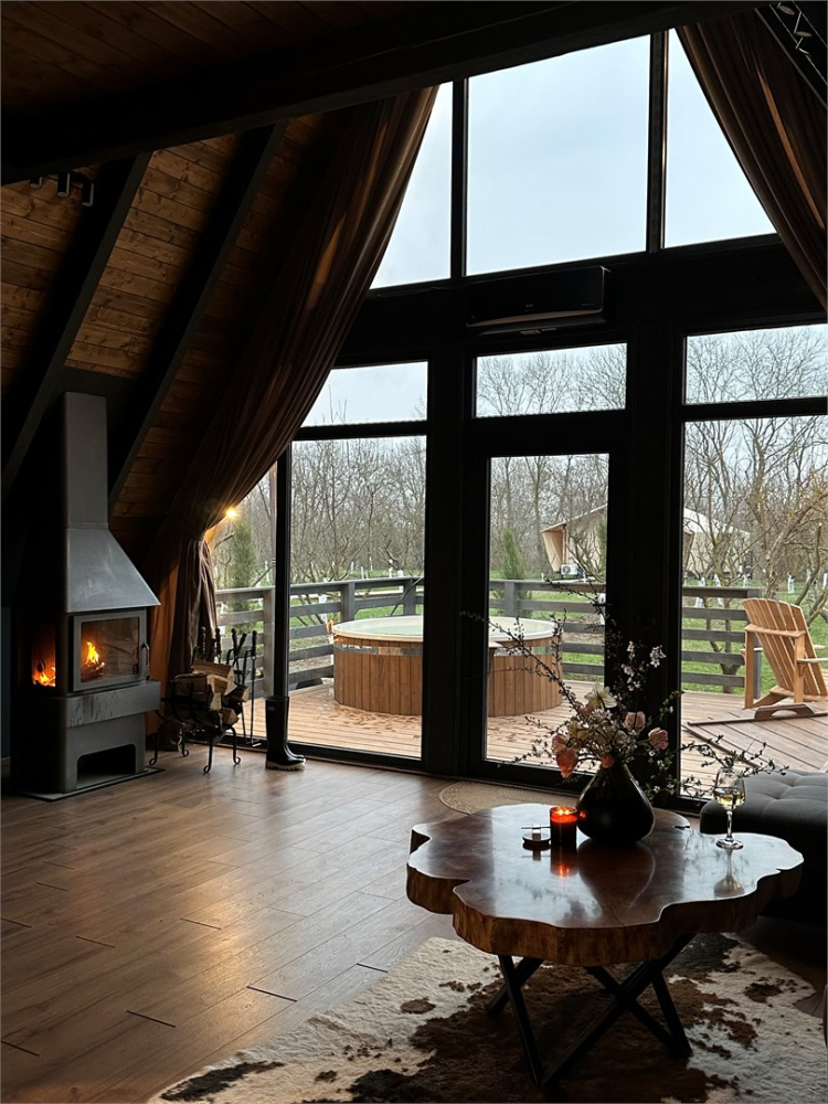 японская бочка фурако на террасе, BQ-зона, индивидуальная костровая зона, раскладной диван и кресло, детская кроватка по запросу, двуспальная кровать, ванная с панорамным видом, уютный камин, TV, Wi-Fi, холодильник, чайник, капсульная кофемашина, набор посуды, приборы, бокалы, санузел с душевой, халат/ тапочки/ полотенца, косметические наборы, зонты, в случае дождливой погоды, отопление (теплый пол, кондиционер, обогрев на кровати)