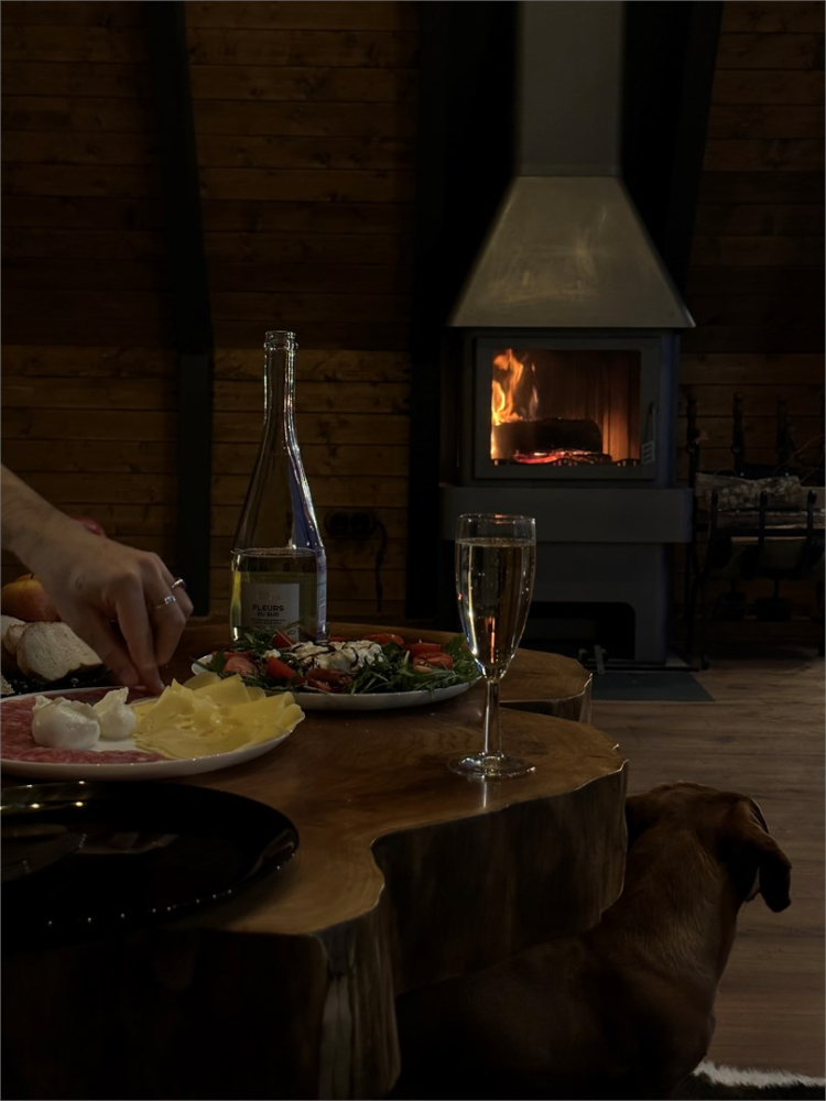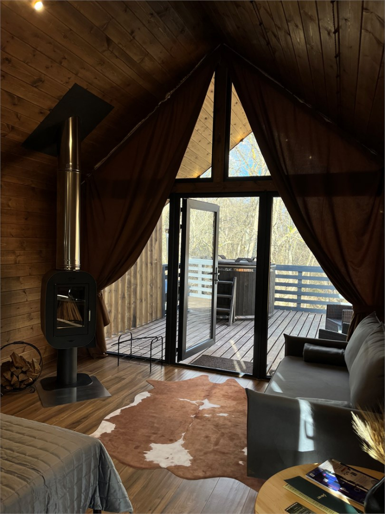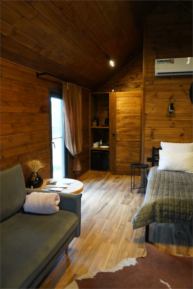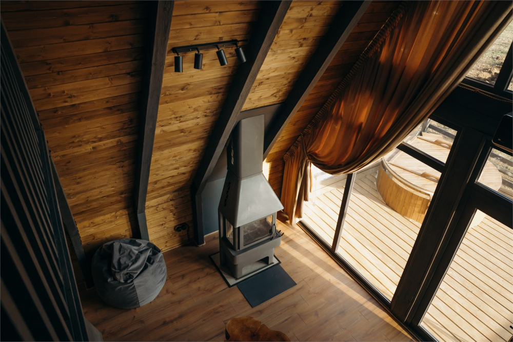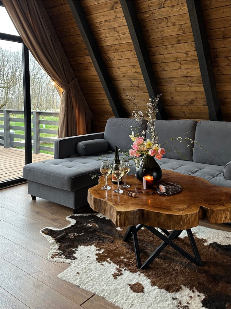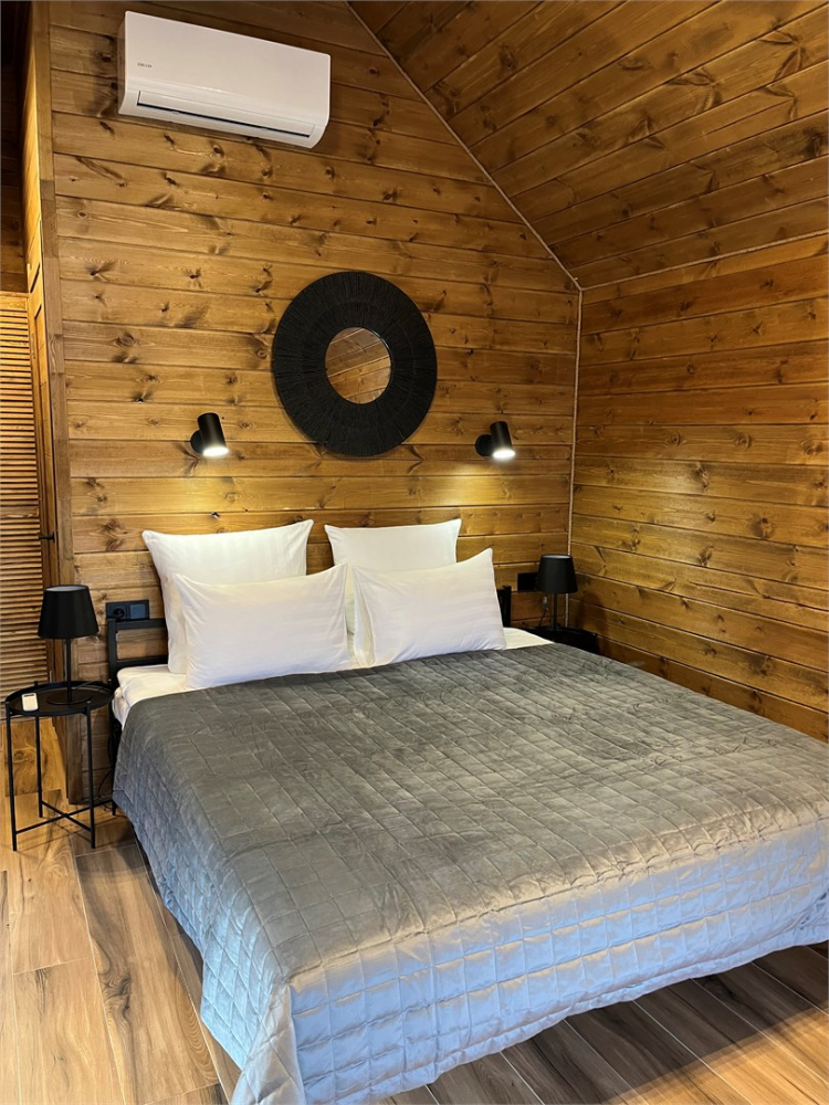 японская бочка фурако на террасе, BQ-зона, индивидуальная костровая зона, раскладной диван и кресло, детская кроватка по запросу, двуспальная кровать, ванная с панорамным видом, уютный камин, TV, Wi-Fi, холодильник, чайник, капсульная кофемашина, набор посуды, приборы, бокалы, санузел с душевой, халат/ тапочки/ полотенца, косметические наборы, зонты, в случае дождливой погоды, отопление (теплый пол, кондиционер, обогрев на кровати)