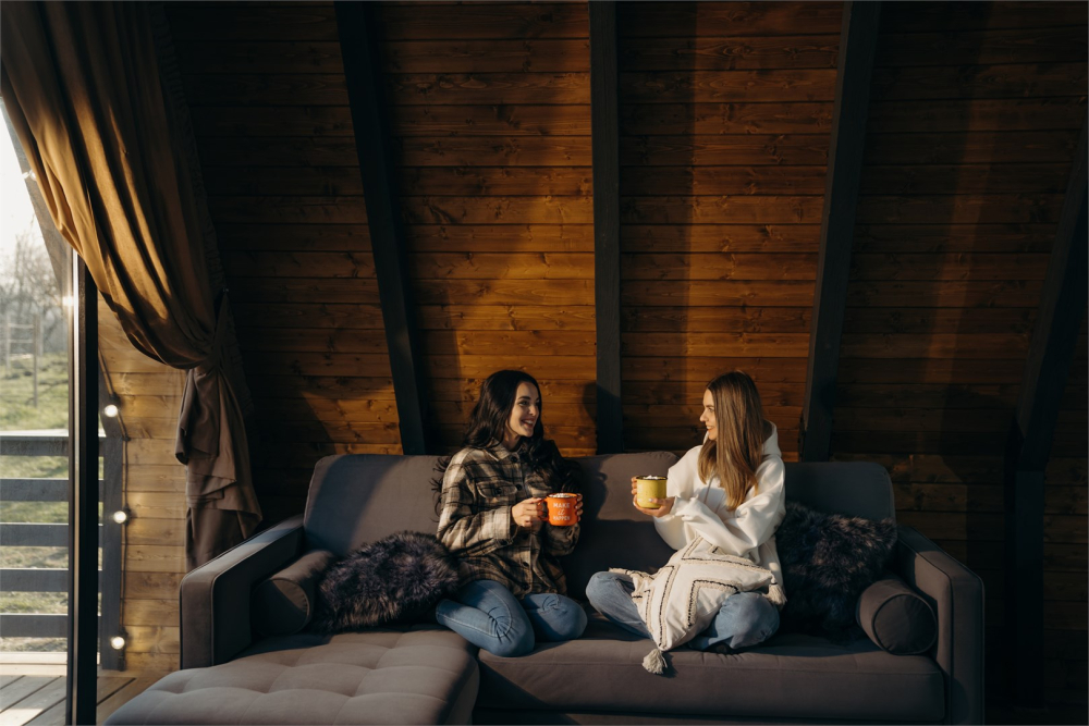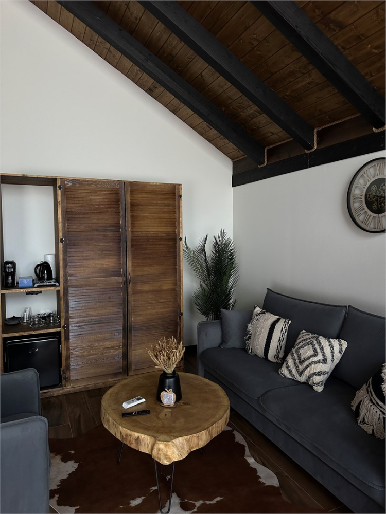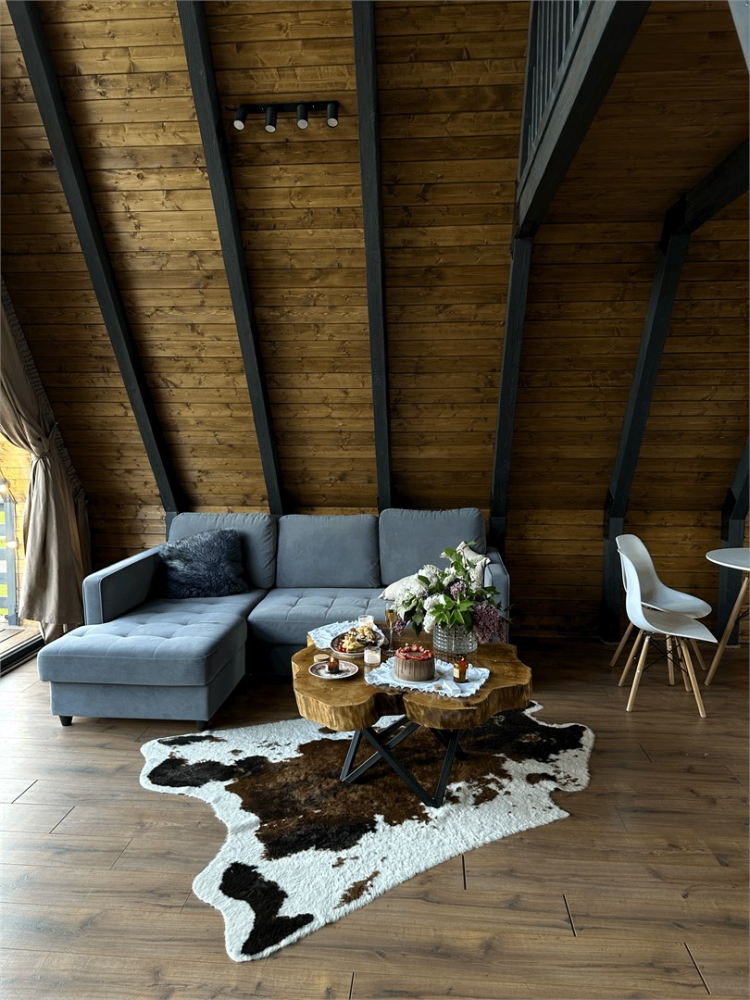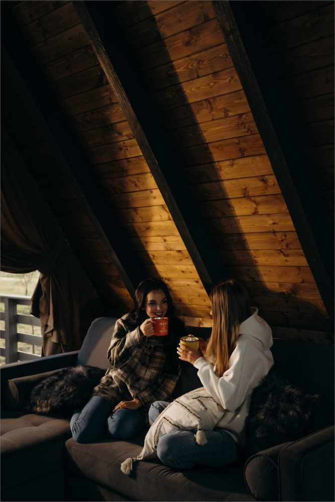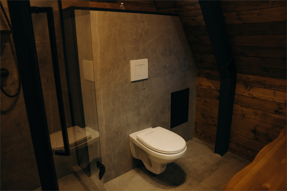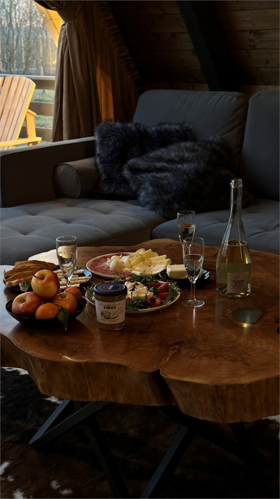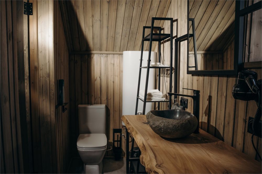 японская бочка фурако на террасе, BQ-зона, индивидуальная костровая зона, раскладной диван и кресло, детская кроватка по запросу, двуспальная кровать, ванная с панорамным видом, уютный камин, TV, Wi-Fi, холодильник, чайник, капсульная кофемашина, набор посуды, приборы, бокалы, санузел с душевой, халат/ тапочки/ полотенца, косметические наборы, зонты, в случае дождливой погоды, отопление (теплый пол, кондиционер, обогрев на кровати)