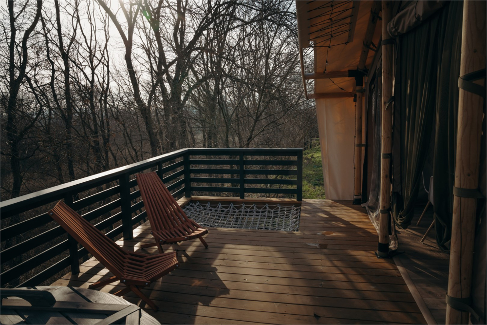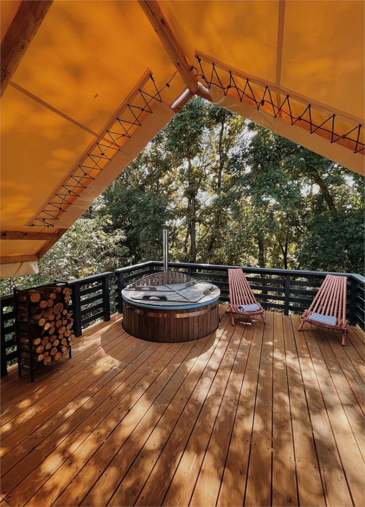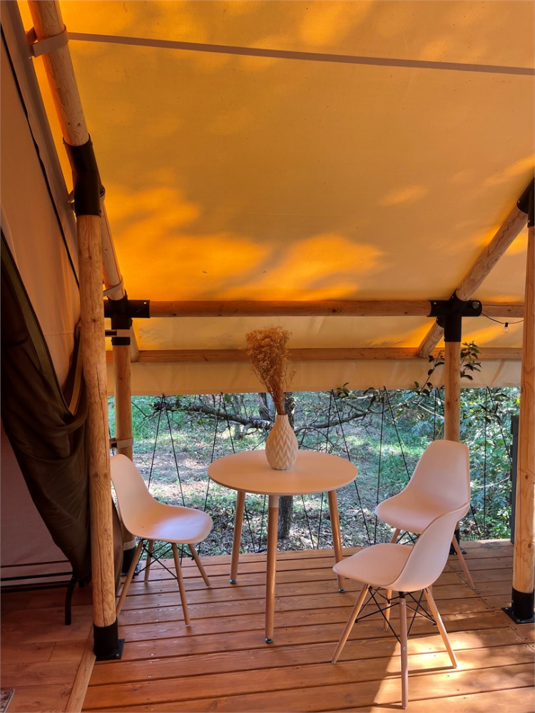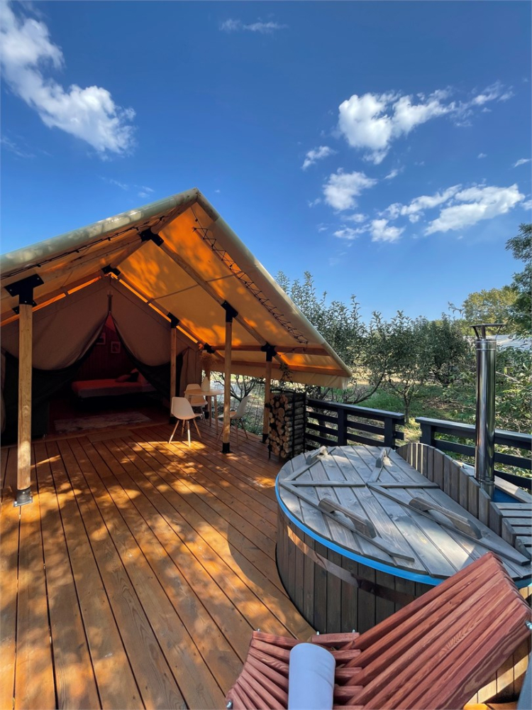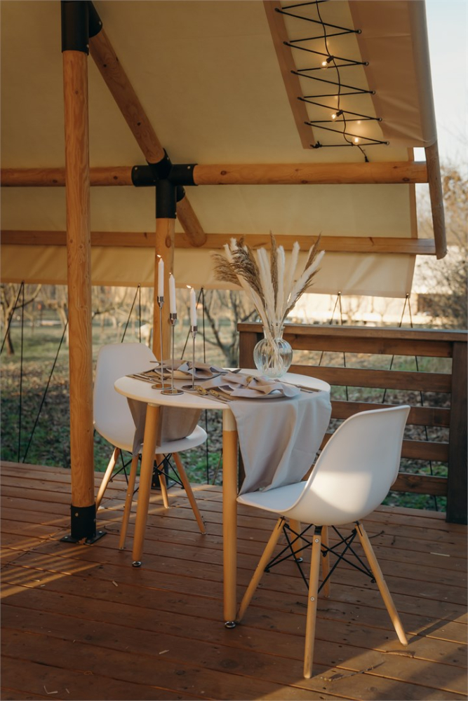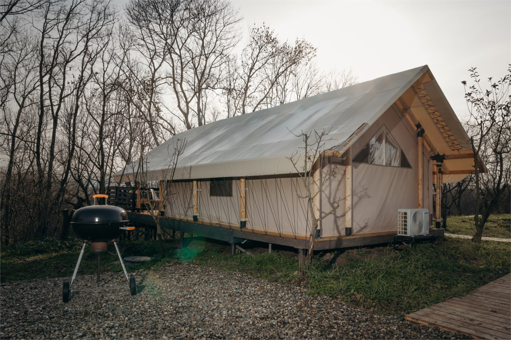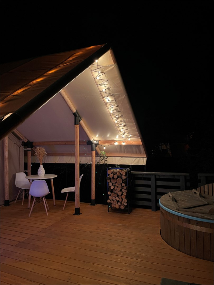 Идеальный и стильный тент для двоих! В дождливые дни у гостей этого тента есть преимущество – крыша над террасой, где вы сможете наслаждаться шумом дождя и свежестью природы. А при хорошей погоде вы можете расслабиться в собственной фурако или приготовить ужин на BQ-зоне около домика. Максимальная вместимость: 3 человека.
