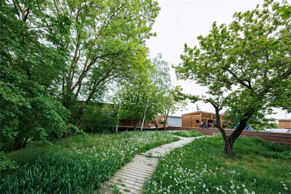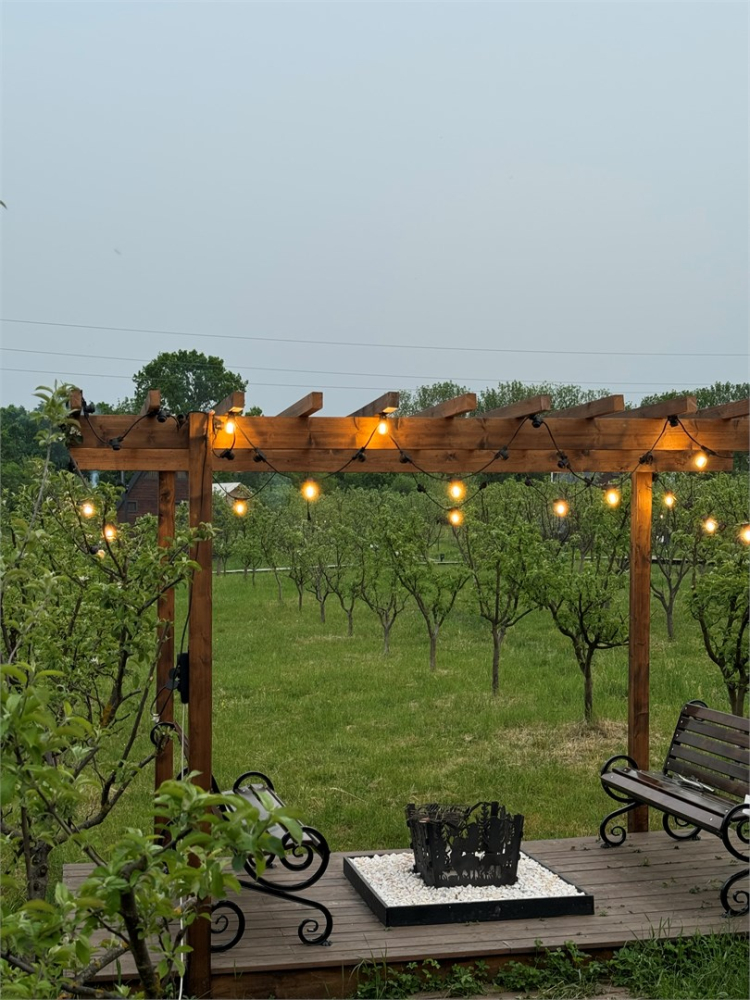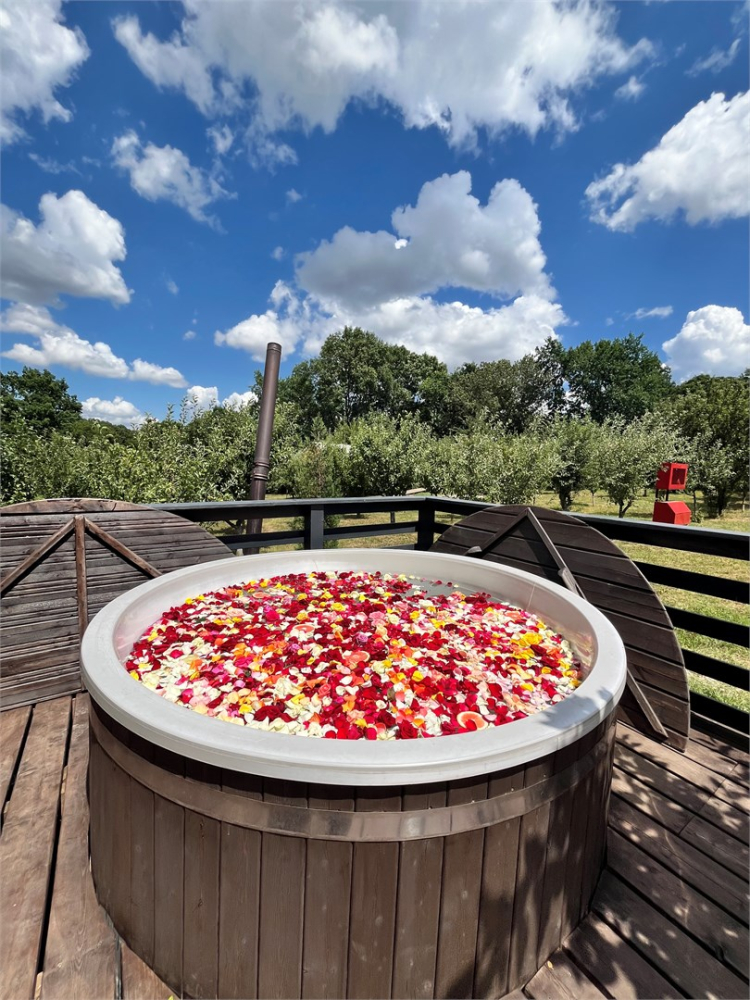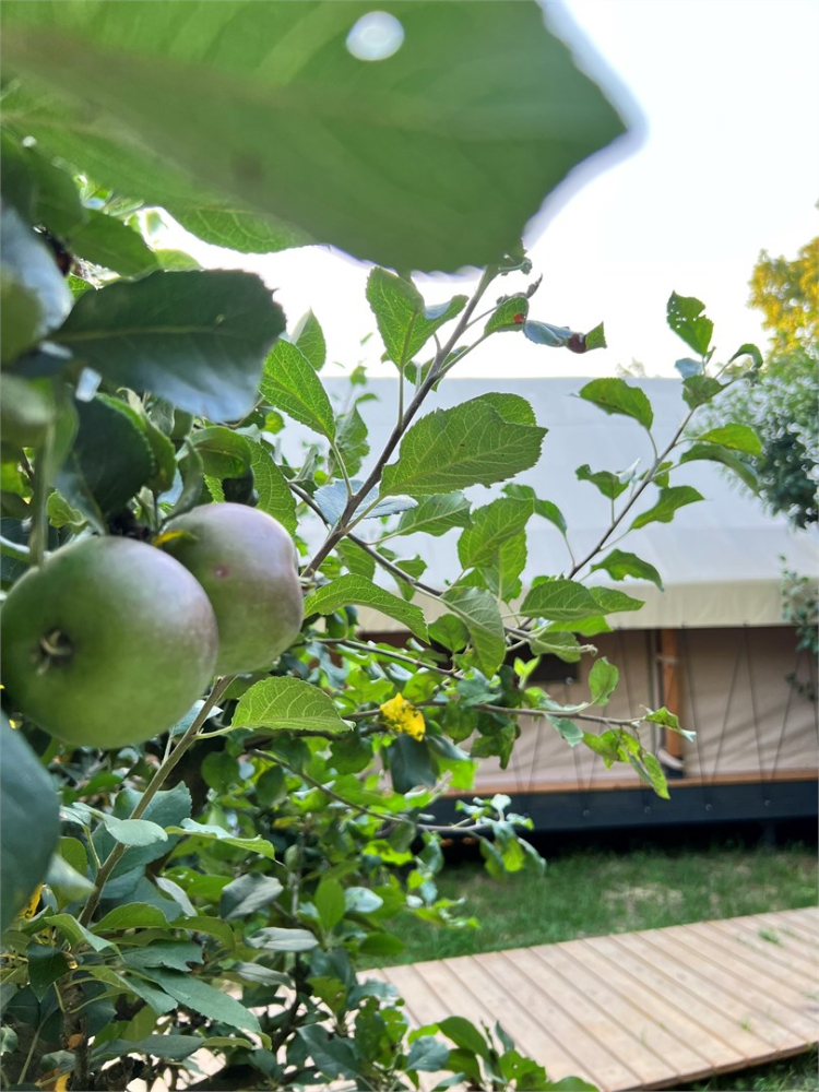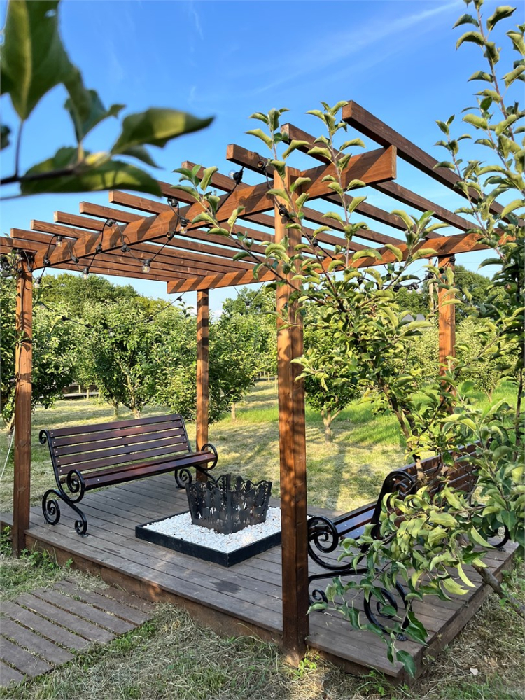 В самом сердце яблоневого сада расположился большой СПА-комплекс, который включен в проживание. Гостям глэмпинга доступны: русская баня, альпийская сауна, бассейны, джакузи с гидромассажем и зона отдыха у камина с детокс-напитками и медом. Находятся на общей территории.