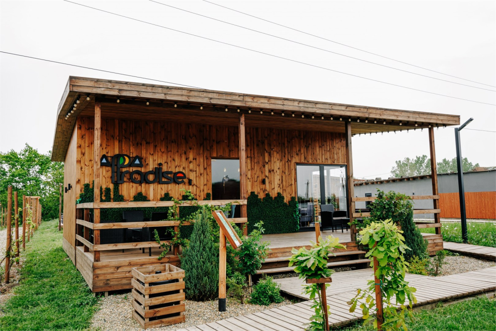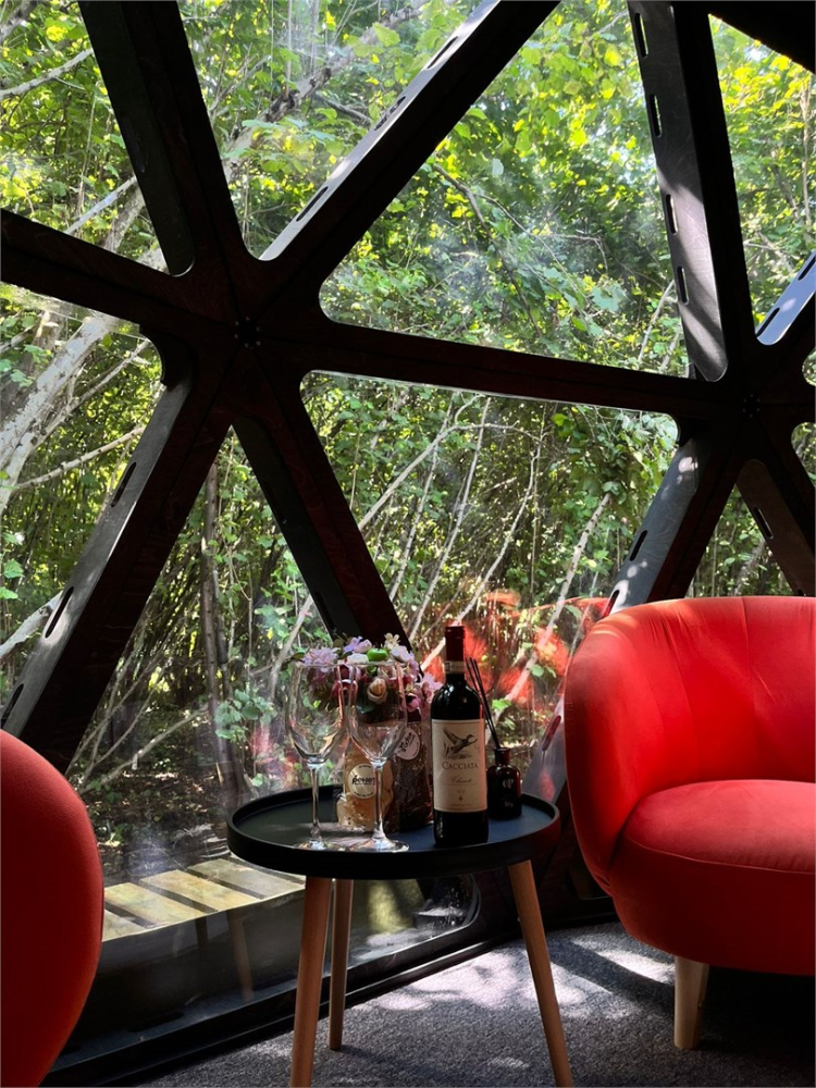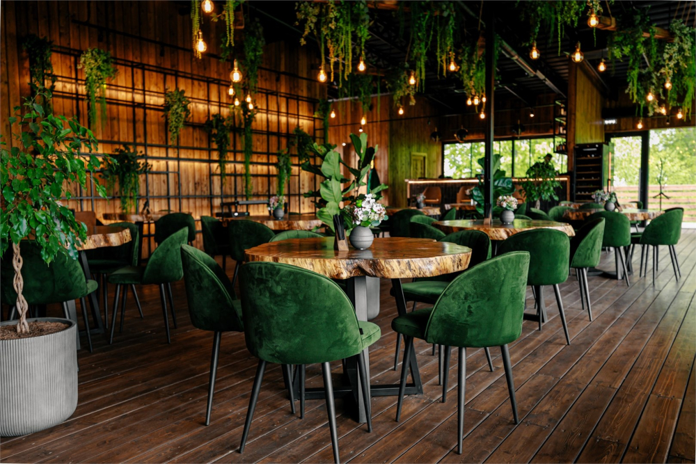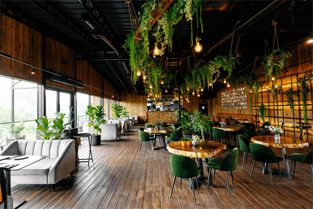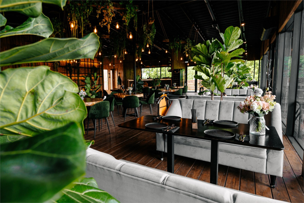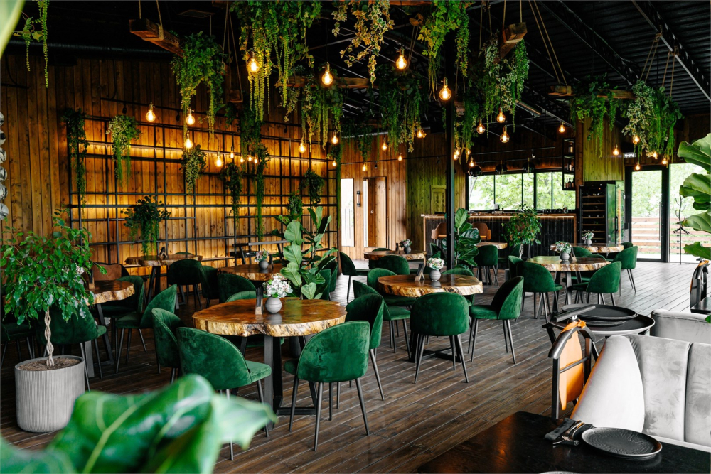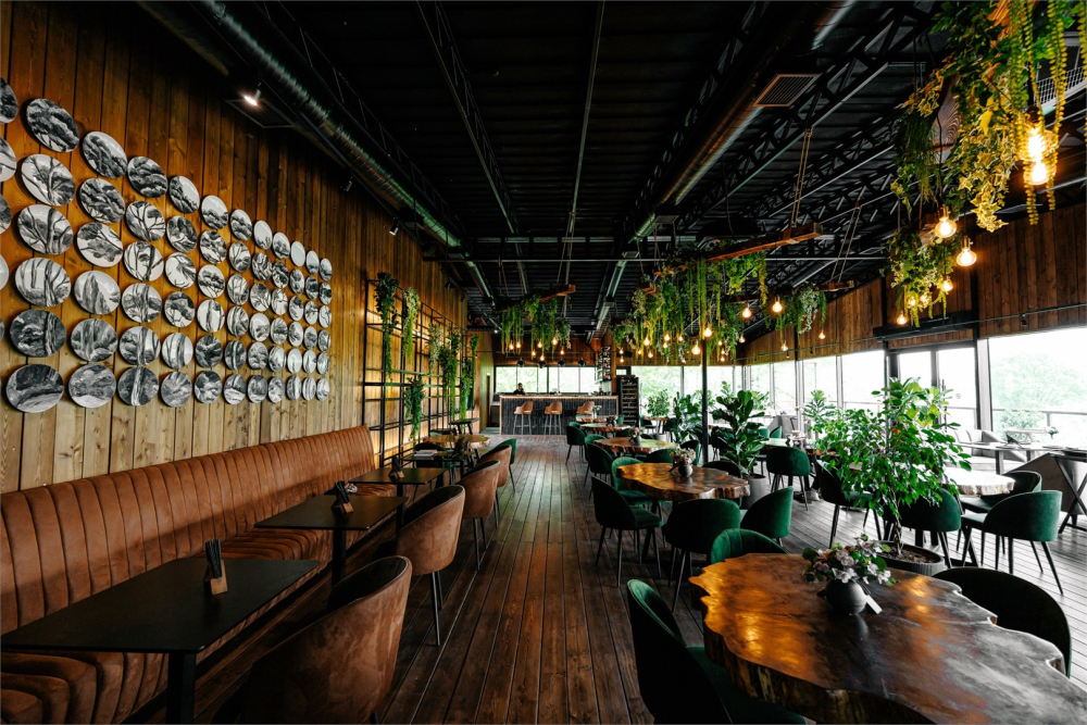 Панорамный ресторан локальной авторской кухни с видом на лес и ореховую рощу.