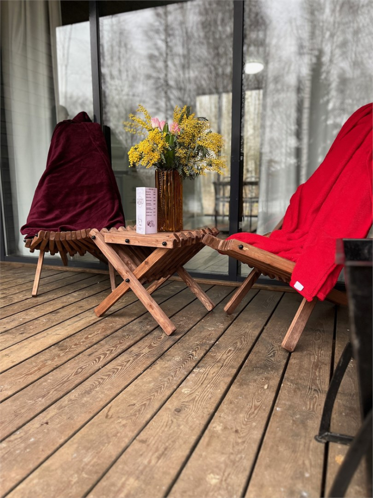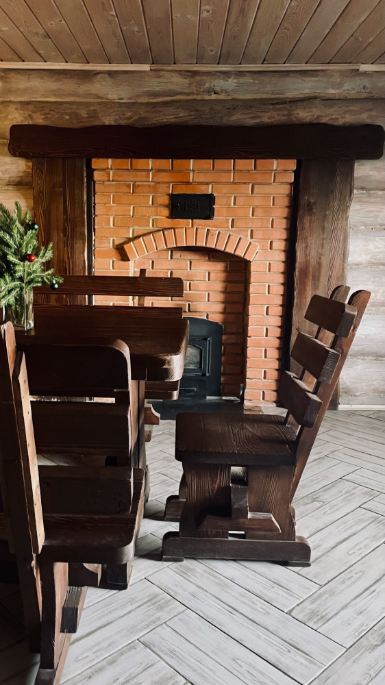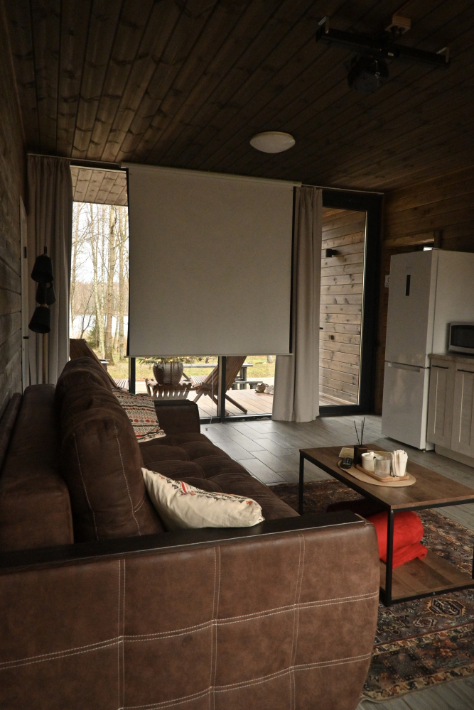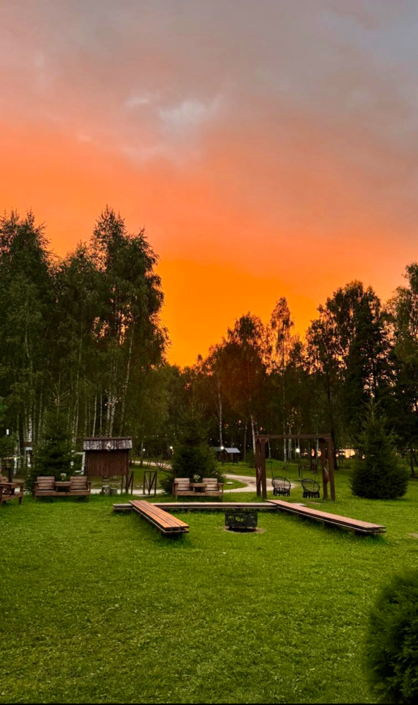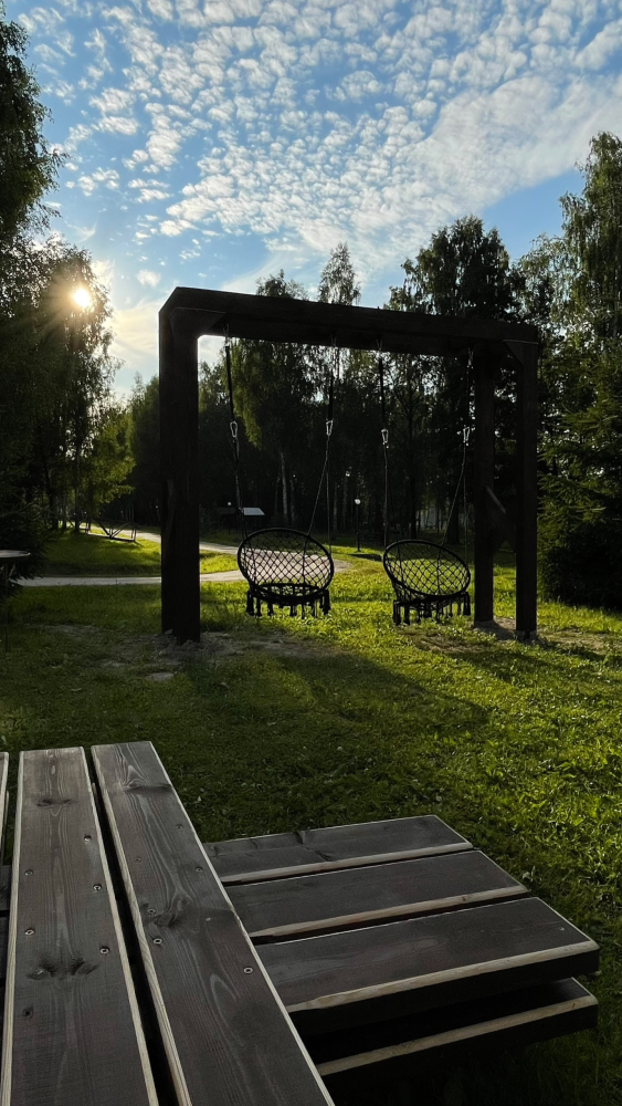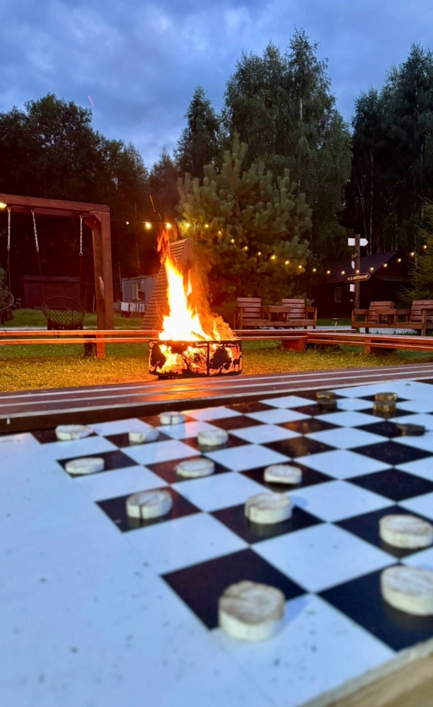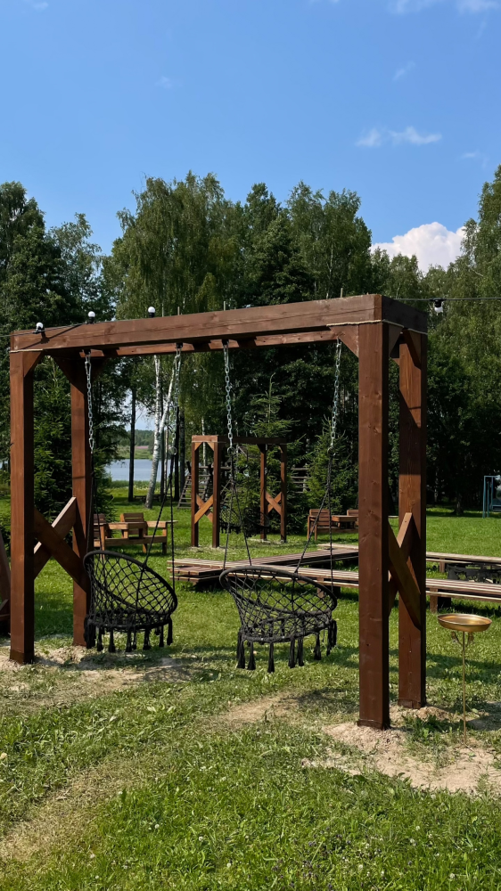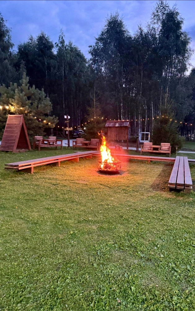 Общая костровая зона — сердце наших вечеров. Здесь собрано всё для душевного отдыха: чаша для костра, удобные деревянные скамьи и уютные качели. А по выходным дням (в хорошую погоду) здесь происходит волшебство: мы натягиваем большой экран и показываем кино и мультфильмы под открытым небом. Идеальное место, чтобы собраться всей семьей или компанией друзей.