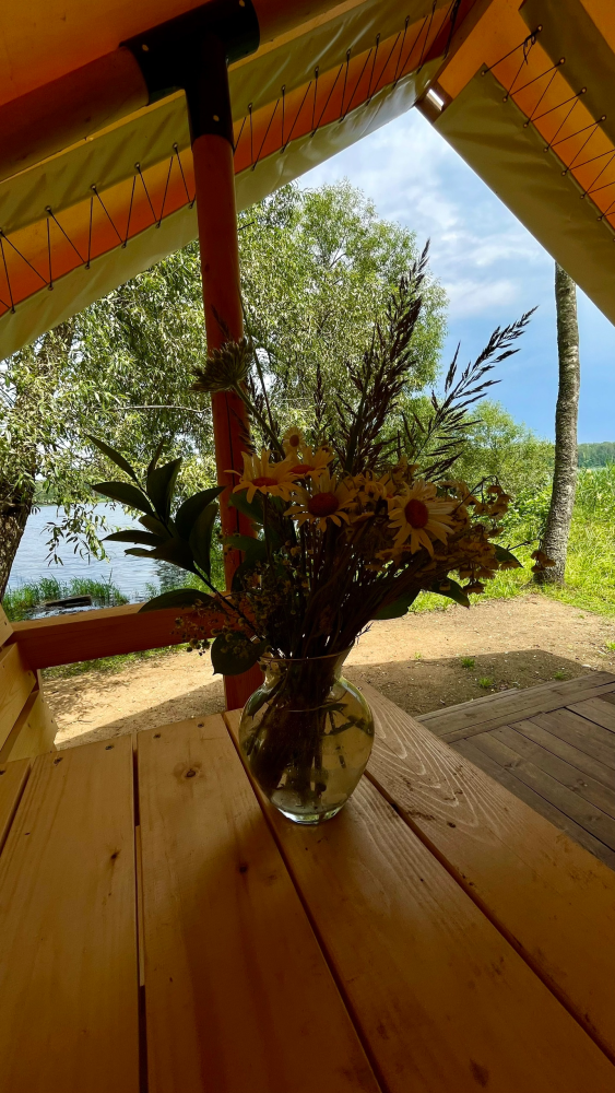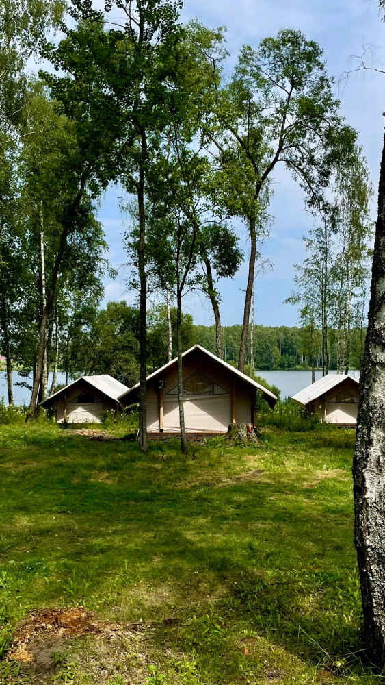 Отдых у самой воды. Все варианты размещения — домики, глэмпинги и кемпинги — находятся прямо на берегу Десны. Для гостей оборудованы 4 помоста: рыбачите, загорайте или ныряйте в чистую воду с комфортом. Река начинается прямо за вашим окном или палаткой.